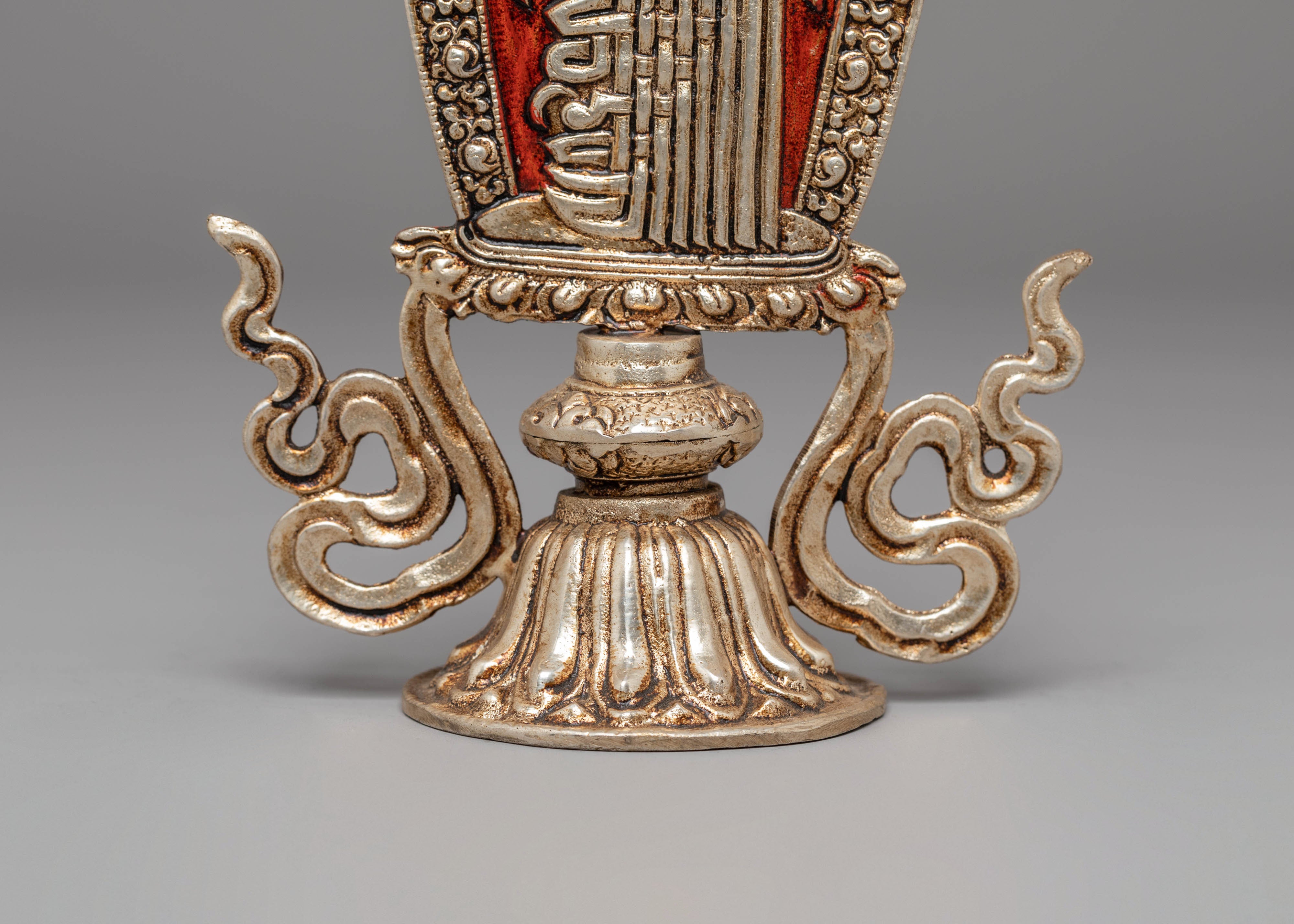 This Sacred Kalachakra Decor showcases exquisite craftsmanship, with a copper body adorned with elegant silver plating, creating a spiritually radiant piece for any altar or meditation space. The central Kalachakra symbol is framed by a richly textured border with raised motifs, which add depth and presence to the design. Its intricate structure reflects the ancient spiritual traditions associated with the Wheel of Time, making it a meaningful piece for Buddhist practitioners and collectors alike.