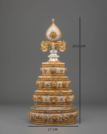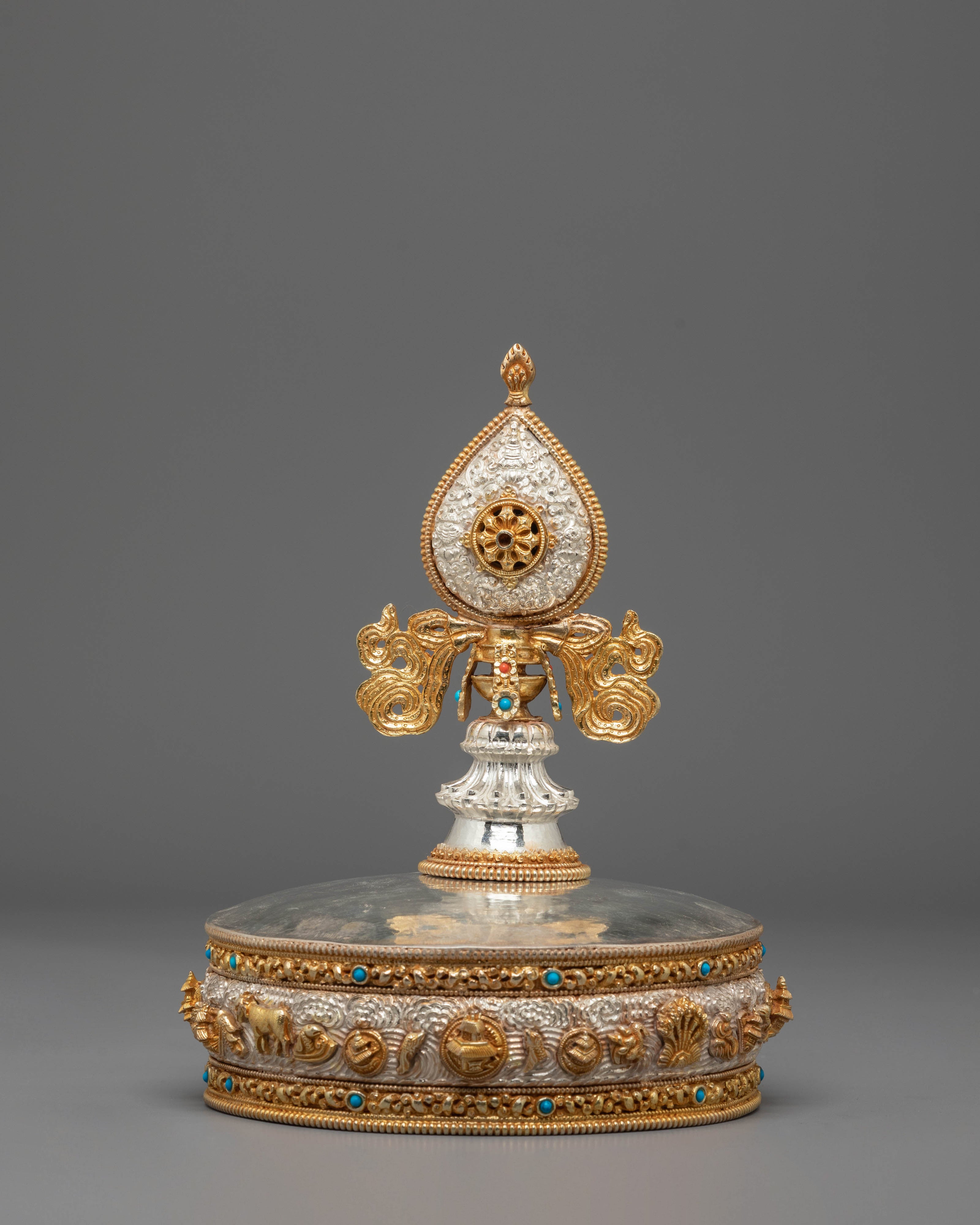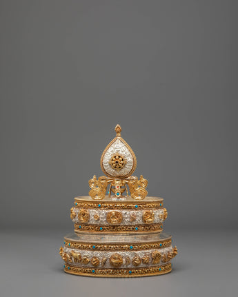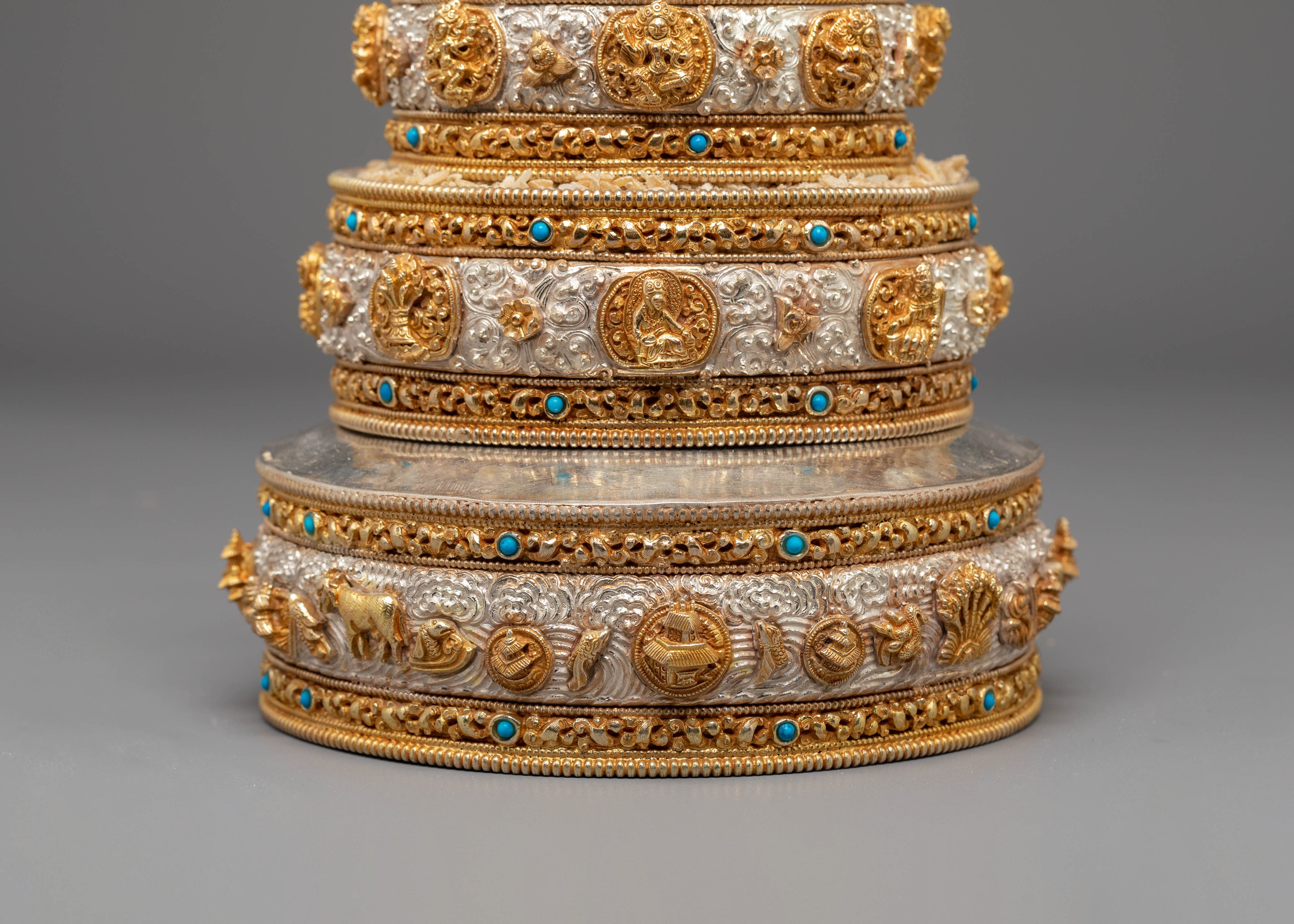 This Sacred Mandala Wall Hanging for Meditation is a beautifully handcrafted piece created with a copper body, pure silver, fire gold, and vibrant turquoise and coral stones. Its tiered structure and ornate symbols reflect traditional spiritual artistry, making it an inspiring addition to any meditation or reflection space. Each layer is thoughtfully designed with meaningful motifs, including sacred animals and protective emblems that carry deep cultural significance. These elements work together to create a powerful visual representation of inner balance and spiritual focus.