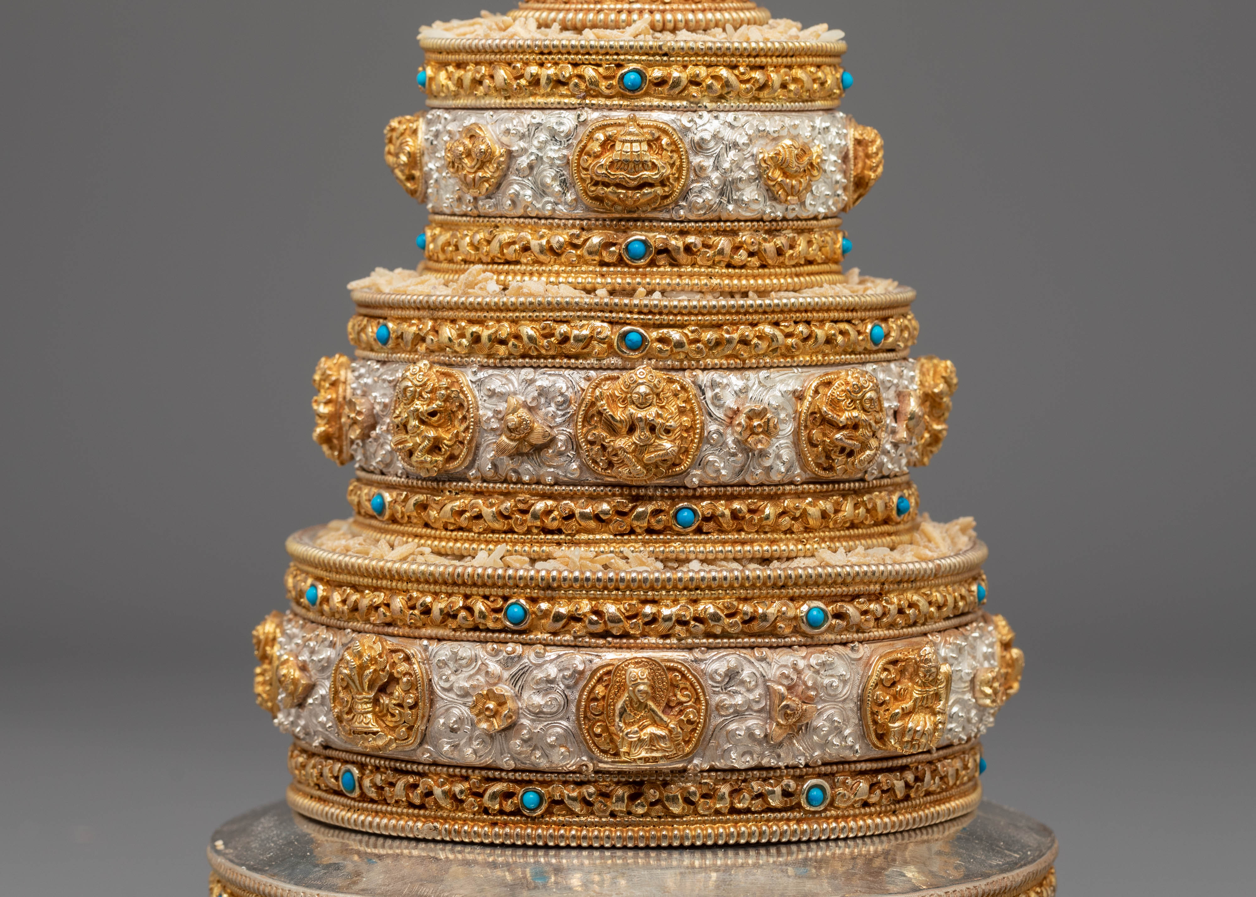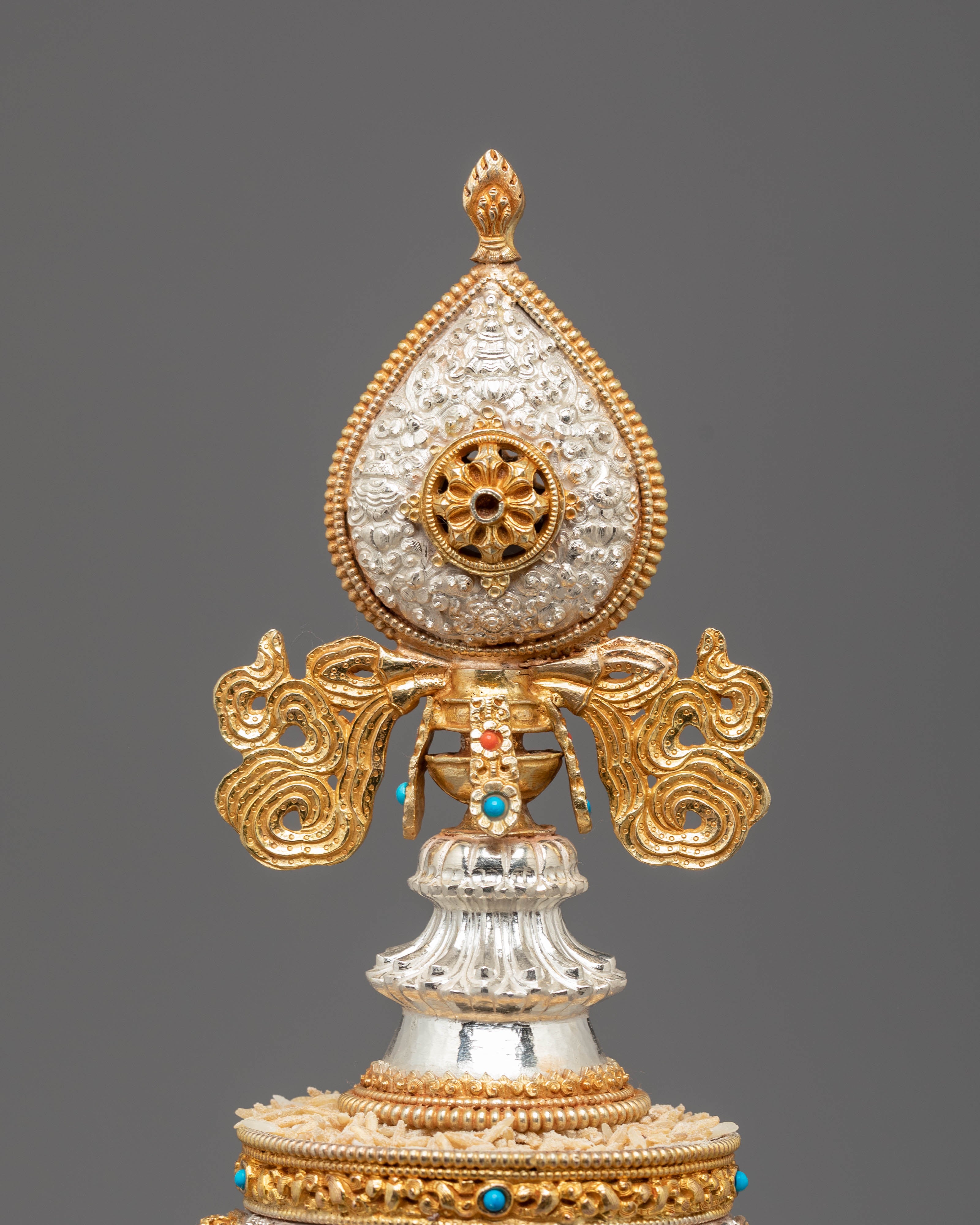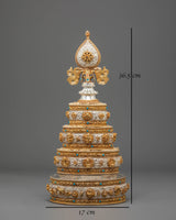 The mandala’s design symbolizes wholeness and the continuous flow of energy. The circular patterns and ascending structure represent the journey toward clarity and higher awareness. Turquoise stones add a soothing visual presence often associated with peace and protection, while touches of fire gold highlight important symbolic details, enhancing the mandala’s spiritual depth. This piece can support a calming environment and help guide the mind toward centeredness during meditation, prayer, or quiet moments.