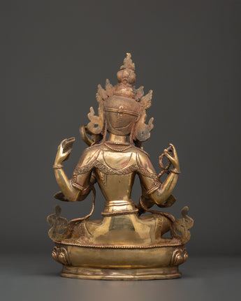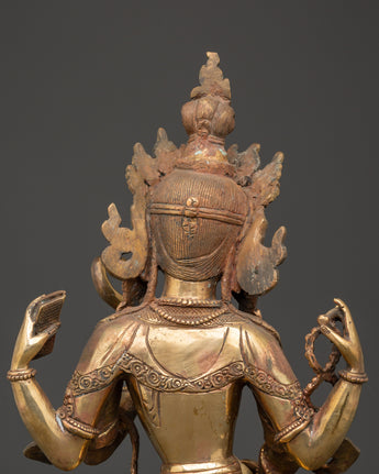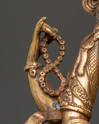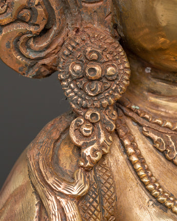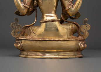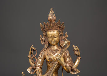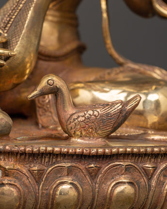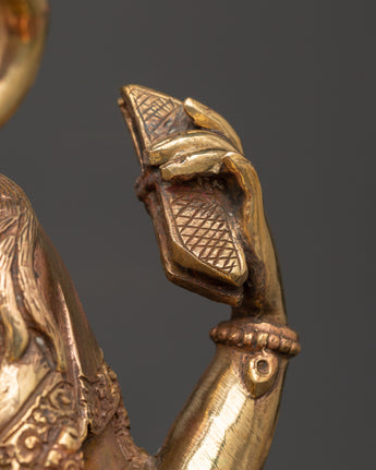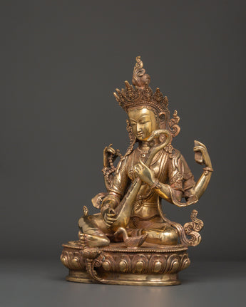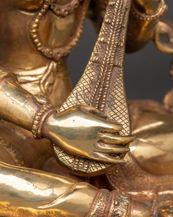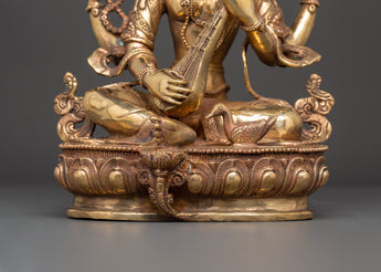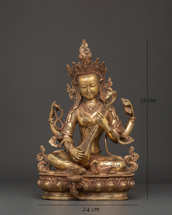 This Saraswati Goddess Statue in Copper depicts the respected Hindu deity of wisdom, music, and the arts. This sculpture is 35 cm tall, 24 cm broad, and weighs 4.67 kg. It is crafted of copper and elegantly gold-plated for a vibrant, magnificent finish. Saraswati is shown in a tranquil reclining position, holding her customary veena (stringed instrument), mala (prayer beads), and scripture, representing the harmony of intellect, creativity, and spiritual understanding. Her peaceful expression, delicate hands, and flowing robes exemplify the elegance and purity of Hindu heritage.