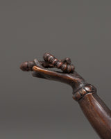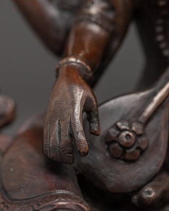 This authentic Saraswati Statue in Oxidized Copper is a stunning representation of the goddess in oxidized copper, reaching 6.1 inches tall. Saraswati, the goddess of learning, knowledge, music, and the arts, is depicted in a contemplative pose, holding a vina, indicating her function as a supporter of the arts. Her additional traits, a book and a prayer chain, symbolize her connection to both the academic and spiritual realms.