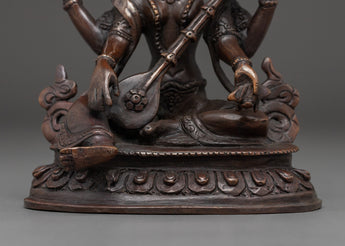 The statue's oxidized copper finish adds depth and antiquity, making it a stylish complement to any altar or sacred place. This item not only adds visual flair to your house, but it also functions as a spiritual symbol, bringing Saraswati's presents of wisdom and creativity into your life.