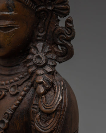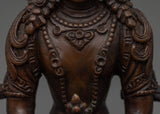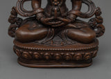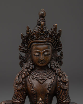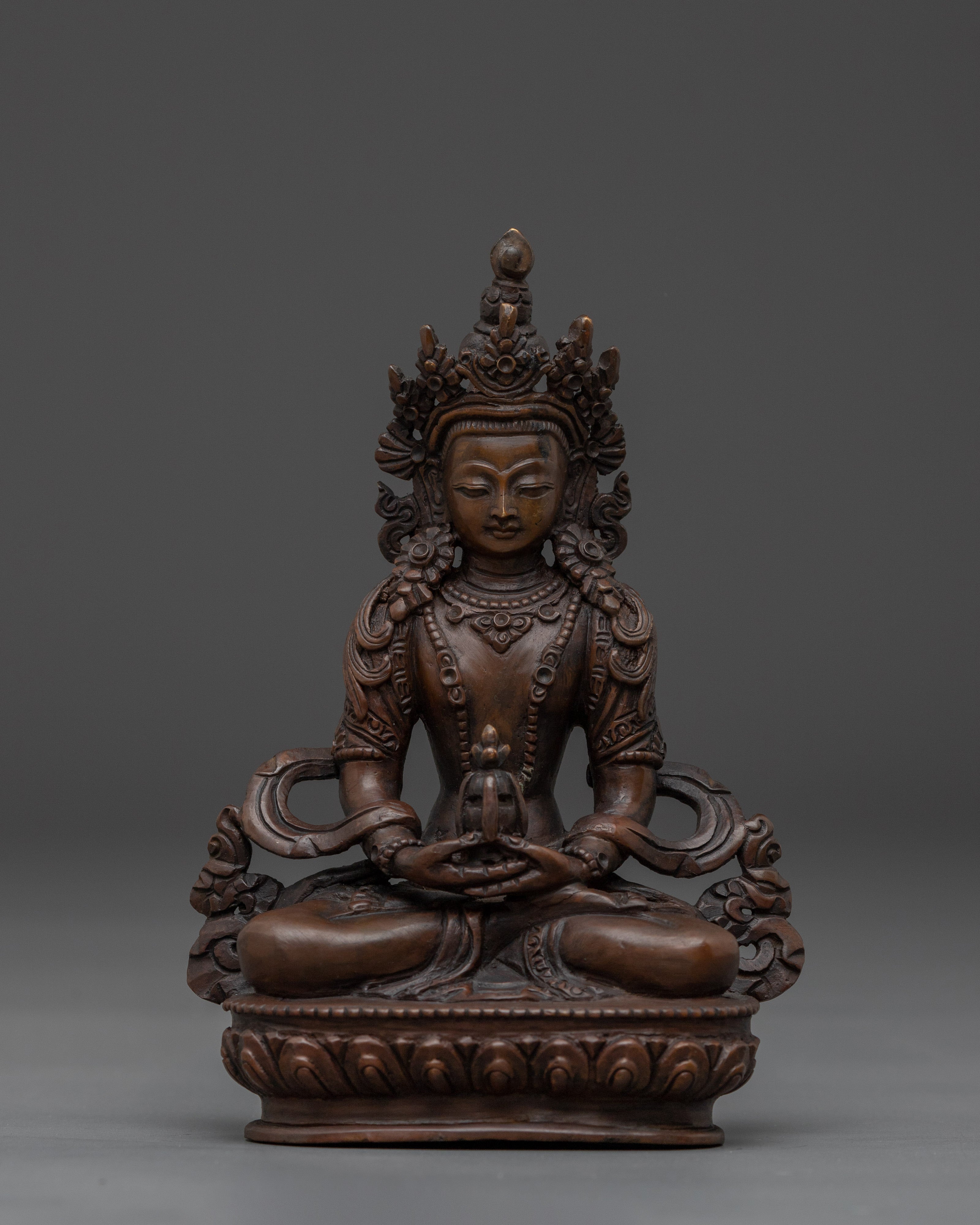 This Serene Amitayus Artwork is known as the deity of longevity, representing eternal life, knowledge, and spiritual blessings. This statue measures 5.5" (Height) x 3.9" (Base) and weighs 0.51 kg. It is made from fine oxidized copper. This artwork is created by expert Nepalese craftsmen representing the holy creativity of Himalayan Buddhism and would make an ideal addition to altars, meditation rooms, or sacred collections.