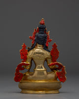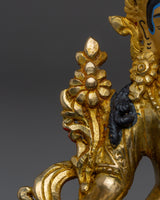 Shyama Tara, revered for her profound compassion and protective qualities, is shown seated gracefully with her right leg extended, symbolizing her readiness to assist others. In her right hand, she holds a lotus, signifying purity and spiritual flourishing. In contrast, her left hand forms the Three Jewel Mudra, paying homage to the Buddha, Dharma, and Sangha, while also holding a lotus to represent ongoing spiritual development. She wears a crown featuring the Five Dhyani Buddhas, symbolizing the five aspects of enlightened wisdom. Seated on a lotus base with a moon disc, her calm yet active posture emphasizes her role as a compassionate guide. The statue’s detailed artistry beautifully reflects her infinite empathy and steadfast dedication to supporting sentient beings on their journey to enlightenment.