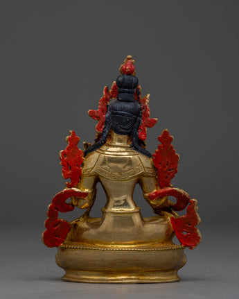 This Serene Green Tara Handcrafted Statue stands at 5.3”/13.5cm in height and 4.1”/10.5cm at the base, weighing 0.51 kg. Made from 24K gold-gilded copper and detailed with gold and acrylic paintings, this compact statue radiates the compassionate and swift-acting energy of Green Tara. Carefully handcrafted by skilled Nepali artisans, it is a perfect addition to personal altars, small meditation spaces, or as a spiritual gift symbolizing protection and guidance.