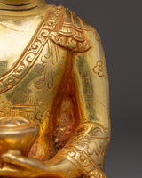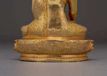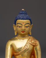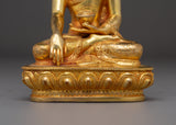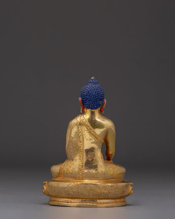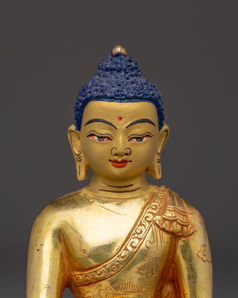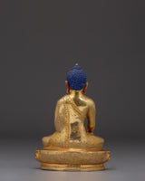 The Shakyamuni Buddha Art in Copper, symbolizing the Buddha's profound teachings and the path to spiritual awakening, is associated with Shakyamuni Buddha. This handcrafted statue is 5.3" (Height) x 3.9" (Base) and weighs 0.66 kg. It is made of copper, decorated with 24K gold gilding, and enhanced with gold and acrylic paints. This sacred statue, created by expert Nepalese artisans, represents the craftsmanship of Himalayan Buddhism, making it an inspirational addition to altars, meditation places, or sacred collections.