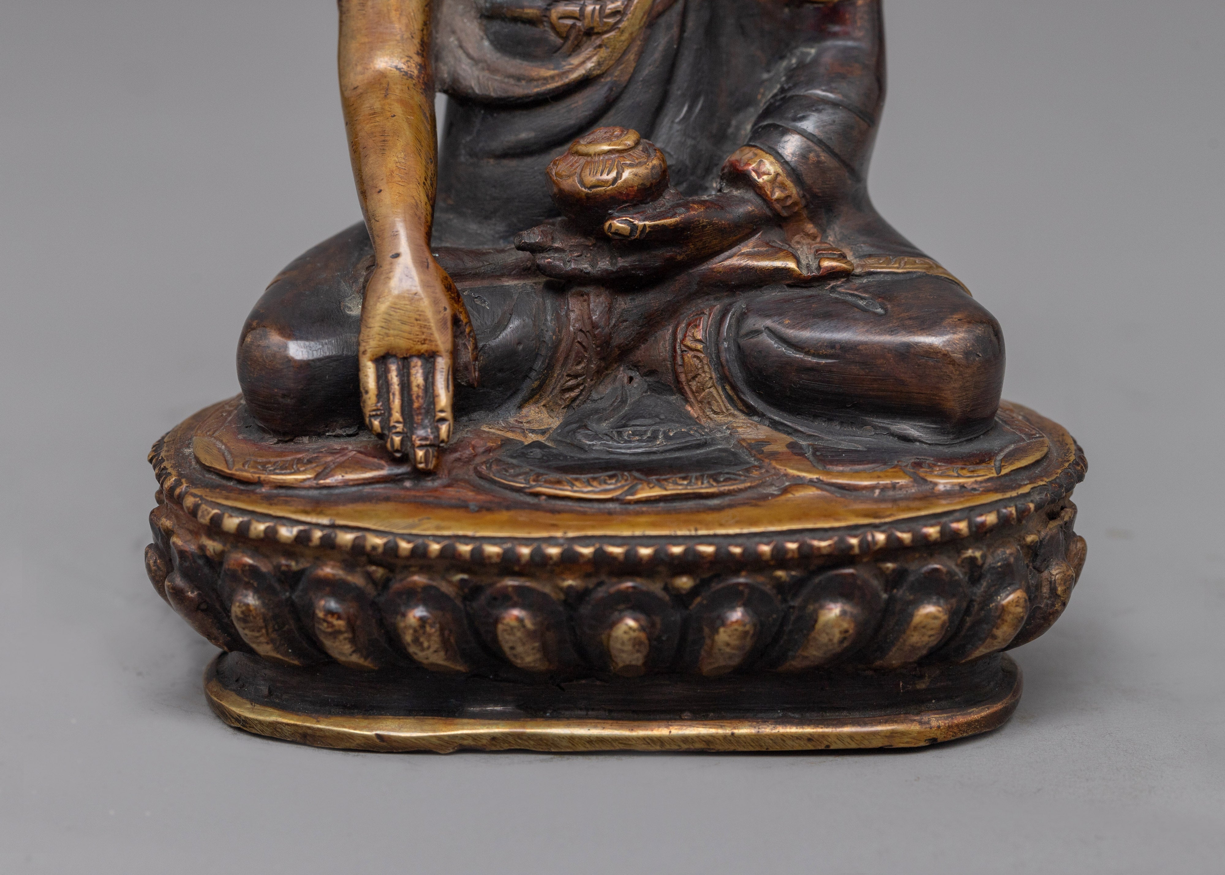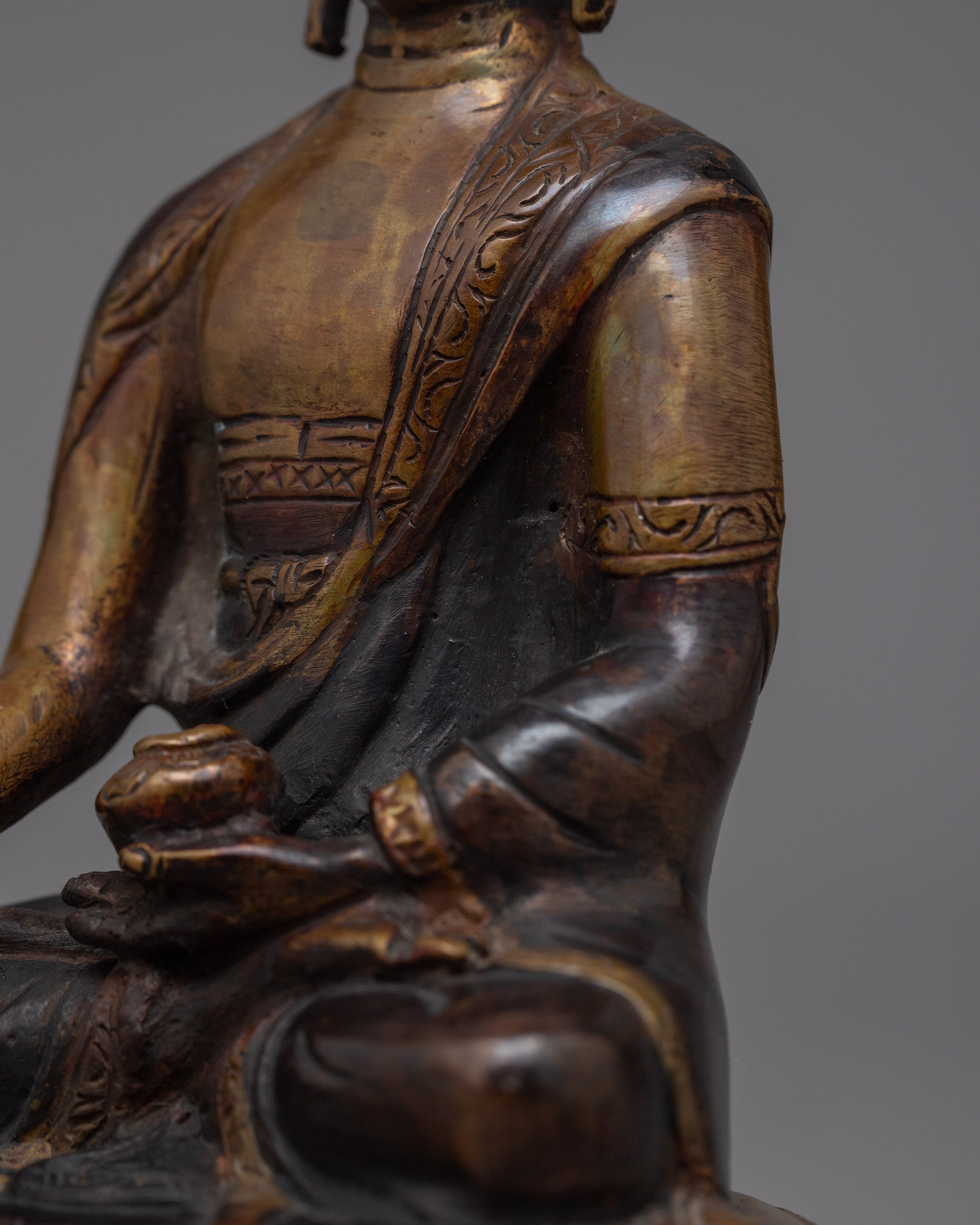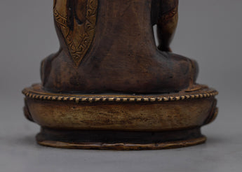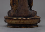 The Shakyamuni Buddha Small-Darkened-Oxidized Statue is a small yet powerful symbol of peace and enlightenment. This 6.1-inch-tall figurine is ideal for compact areas, fitting perfectly on shelves, desktops, or in peaceful meditation nooks. Its solid, oxidized copper body weighs 0.54 kg and features a darker finish that highlights the rich textures and shapes of Buddha's robes, as well as his tranquil demeanor. This creative style not only provides visual depth but also conjures a sense of ancient wisdom that has been preserved over time.