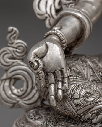 This Silver Green Tara Statue stands at 9.8”/25cm in height and 7.5”/19cm at the base, weighing 2.17 kg. Elegantly silver-plated, the statue depicts Green Tara—the embodiment of compassionate action and swift protection—seated in a posture of readiness, with one leg extended to symbolize her immediate responsiveness to those in need. Handcrafted by skilled Nepali artisans, this refined piece is ideal for altars, spiritual corners, or as a serene addition to meditation spaces.