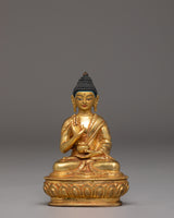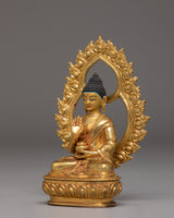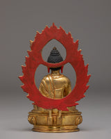 The Buddha is depicted seated in a poised meditative posture, with the right hand raised in the abhaya mudra—an ancient gesture symbolizing fearlessness, courage, and protection. The calm expression, finely detailed robes, and smooth contours reflect careful artisan workmanship. The decorative halo behind the Buddha is enriched with floral and flame motifs that represent clarity, transformation, and spiritual radiance. The gold-plated finish adds warmth and a gentle glow to the sculpture.