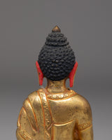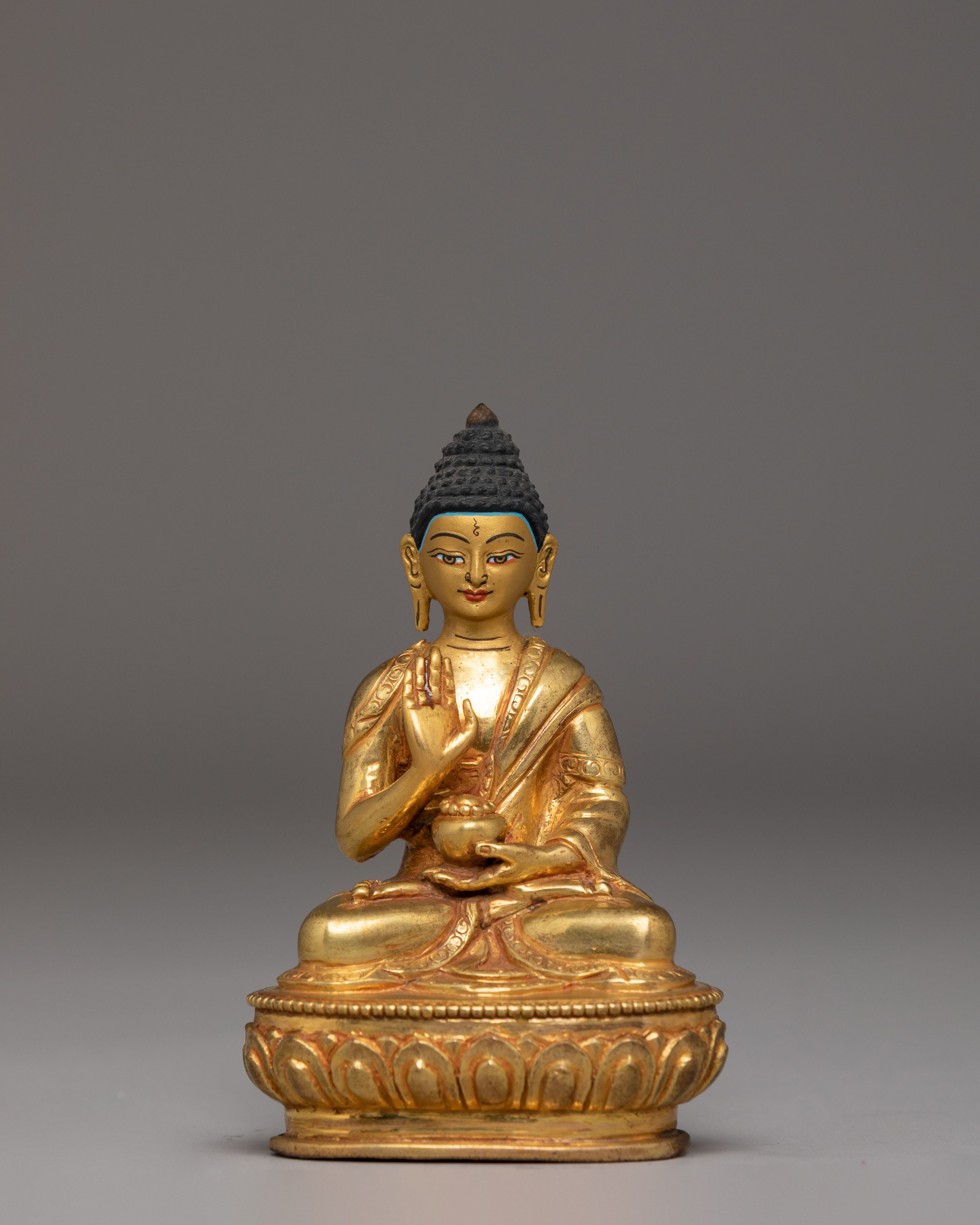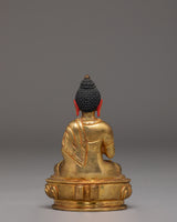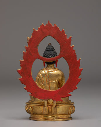 This Statue of Amoghasiddhi Buddha is crafted from a copper body with elegant gold plating, measuring 12.5cm in height and 8.5cm in width, and weighing 0.33kg. Small yet visually striking, it embodies the peaceful strength associated with Amoghasiddhi, the Buddha of Accomplished Action. This piece is ideal for enhancing meditation rooms, altar arrangements, or meaningful display spaces that celebrate Buddhist symbolism and Himalayan craftsmanship.