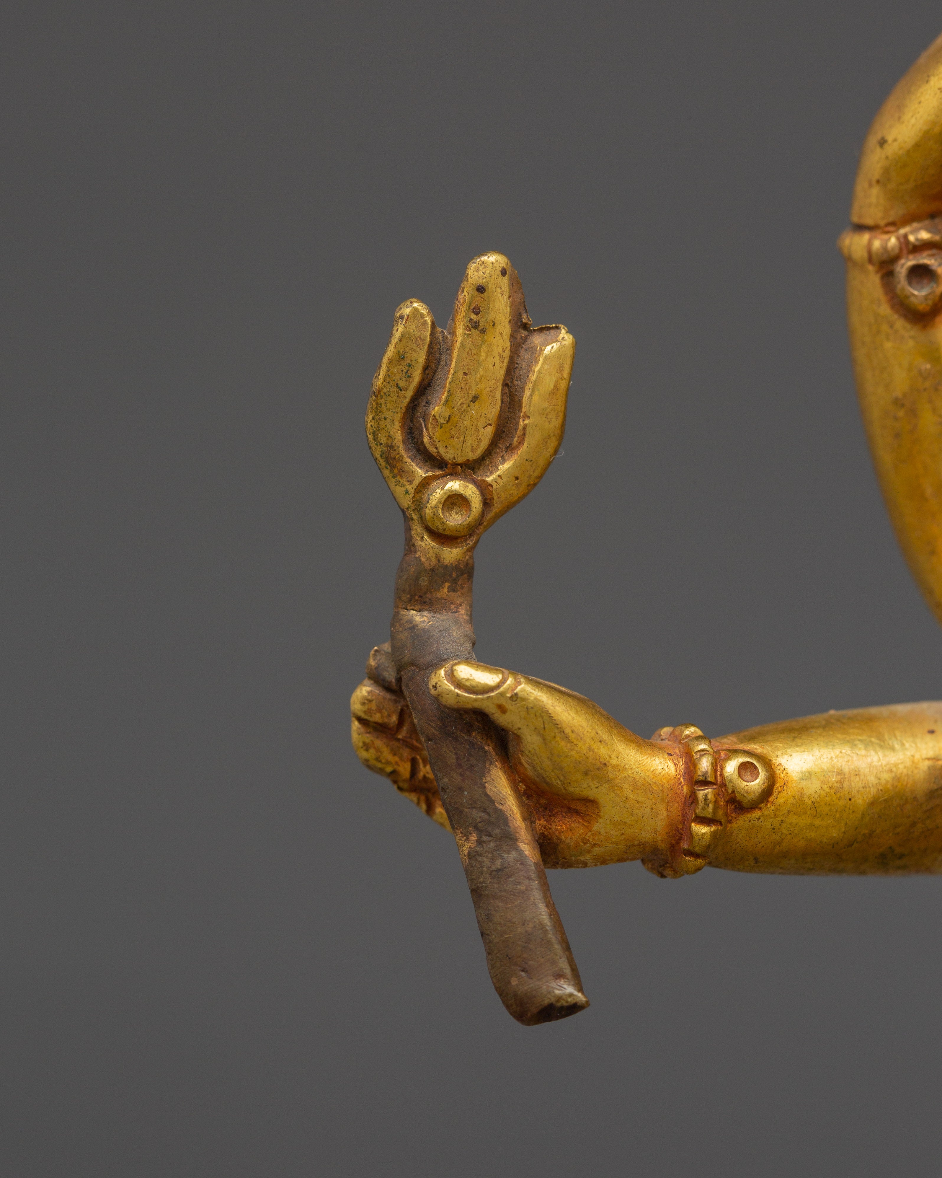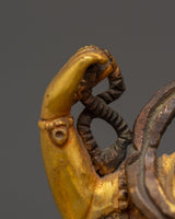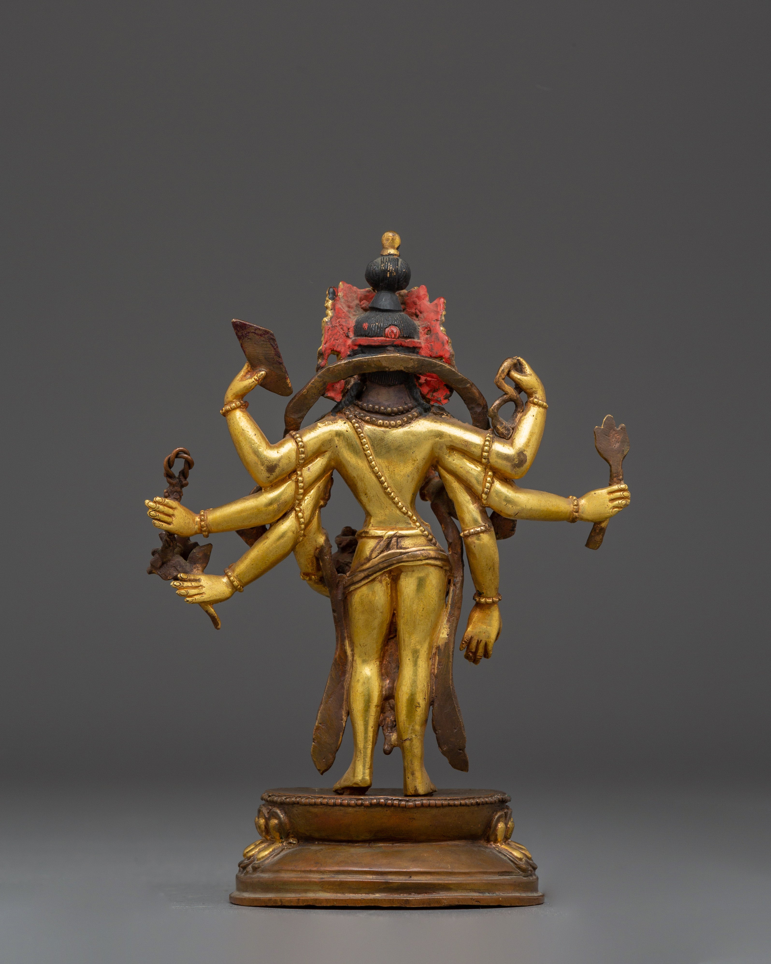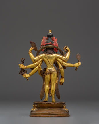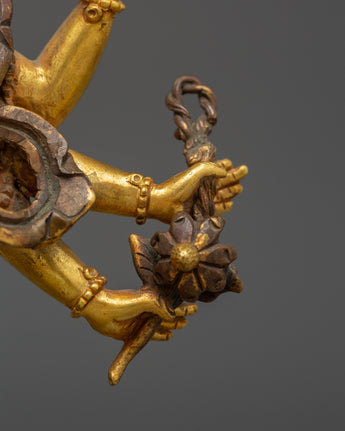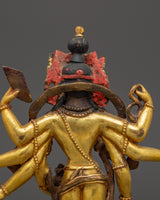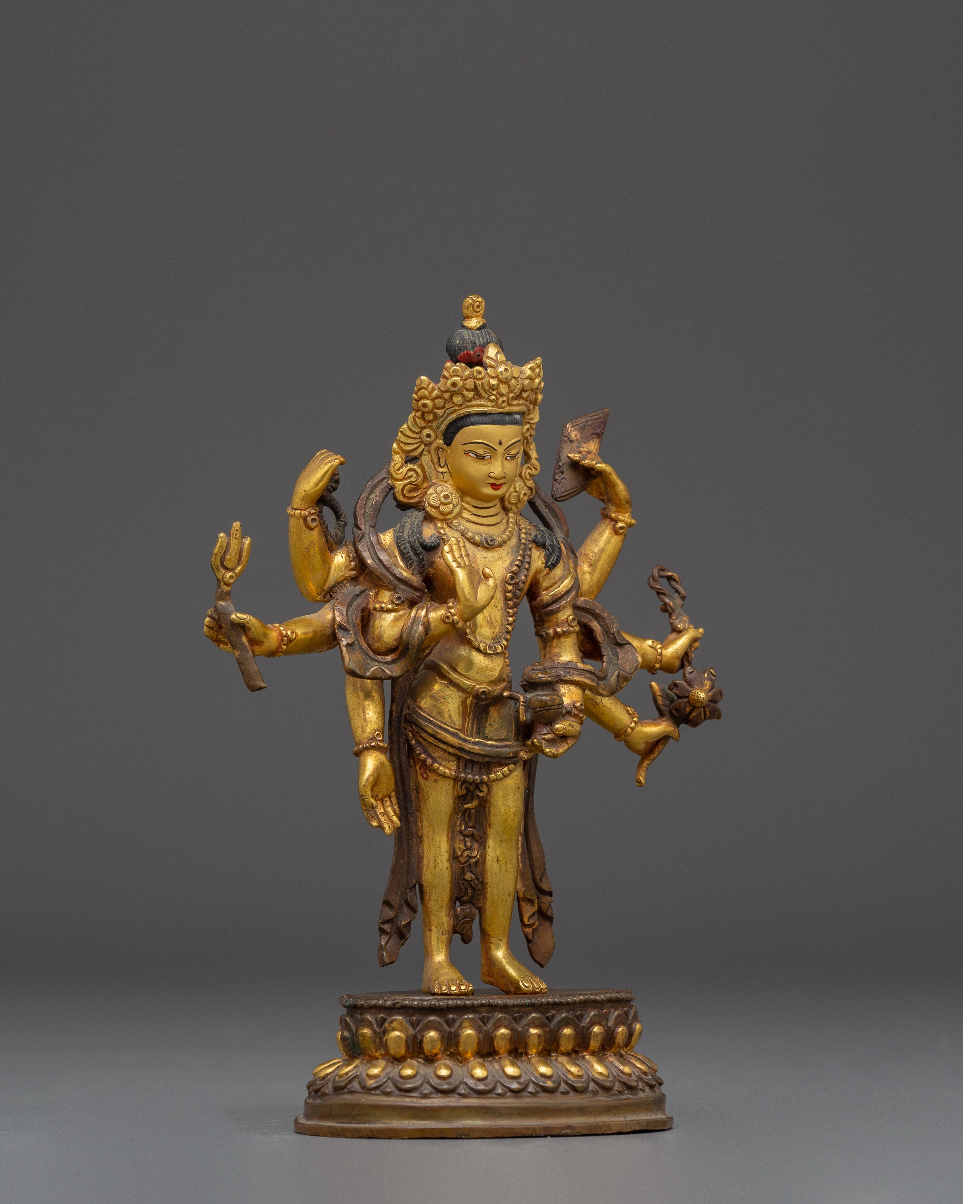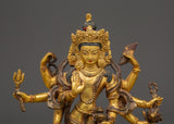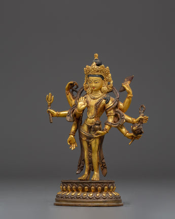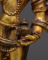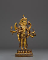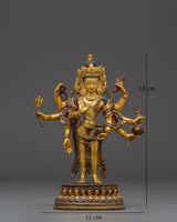 This Bodhisattva Lokeshwor statue is a remarkable piece of art, carefully handmade from copper and adorned with a stunning gold gilded finish. Standing at 18 cm tall, this sculpture captures the serene and compassionate presence of Lokeshwor, a Bodhisattva symbolizing protection and mercy. With multiple arms, each holding sacred objects like a lotus, trident, and ritual vessel, the figure represents the Bodhisattva’s power to bring peace and remove suffering. The finely detailed craftsmanship showcases the beauty of the deity’s pose, robes, and facial expression, making it an excellent representation of divine grace and spiritual strength.
