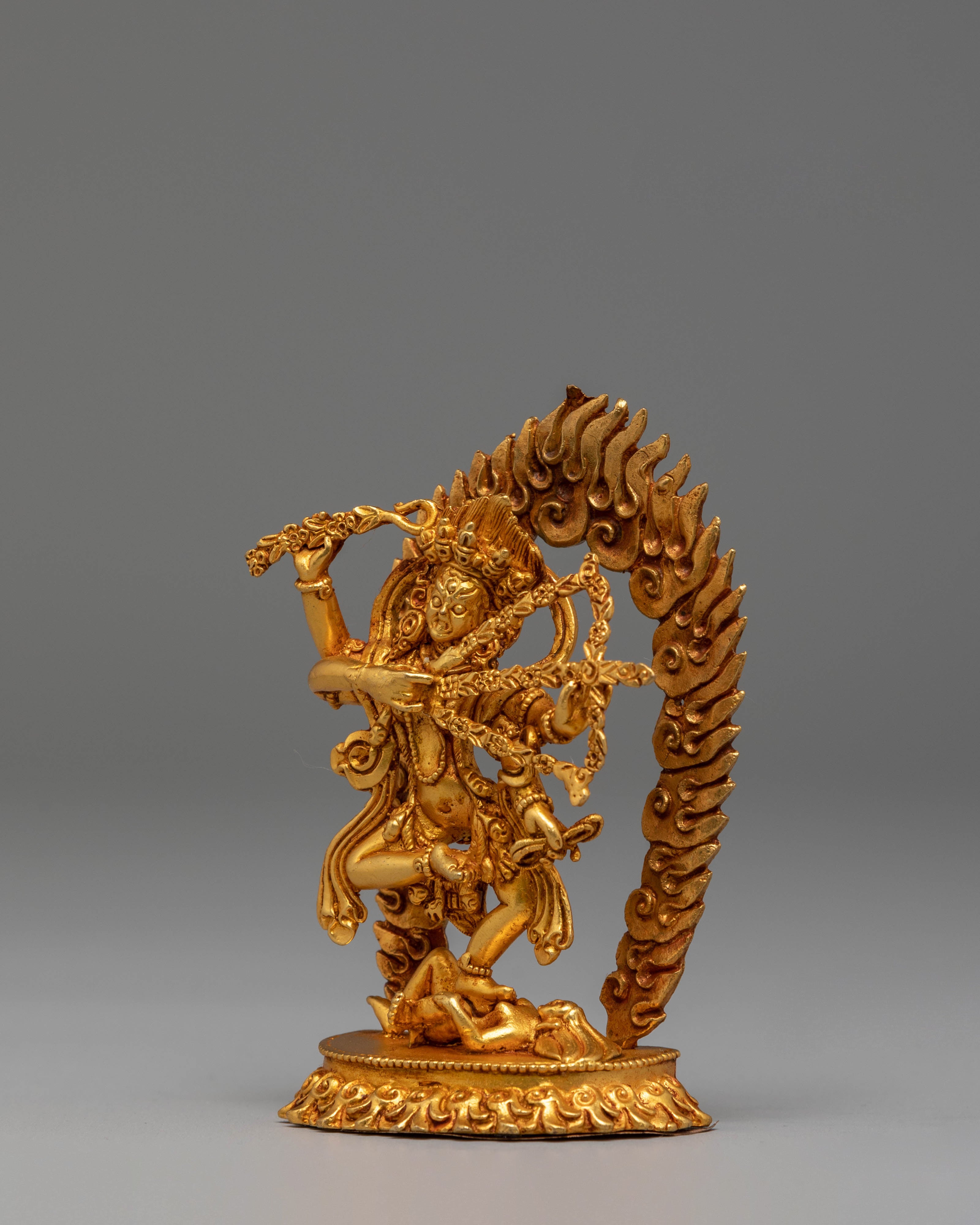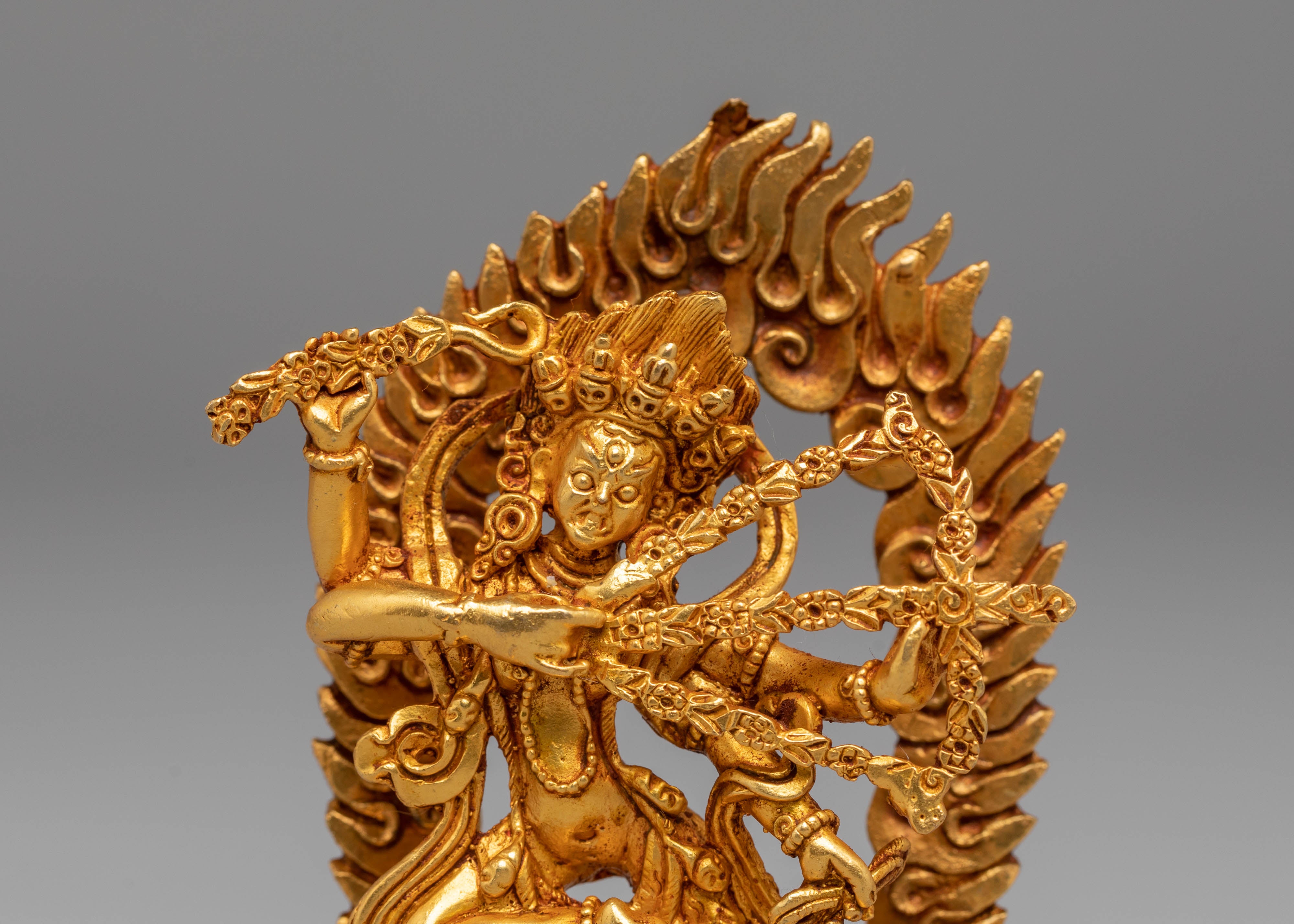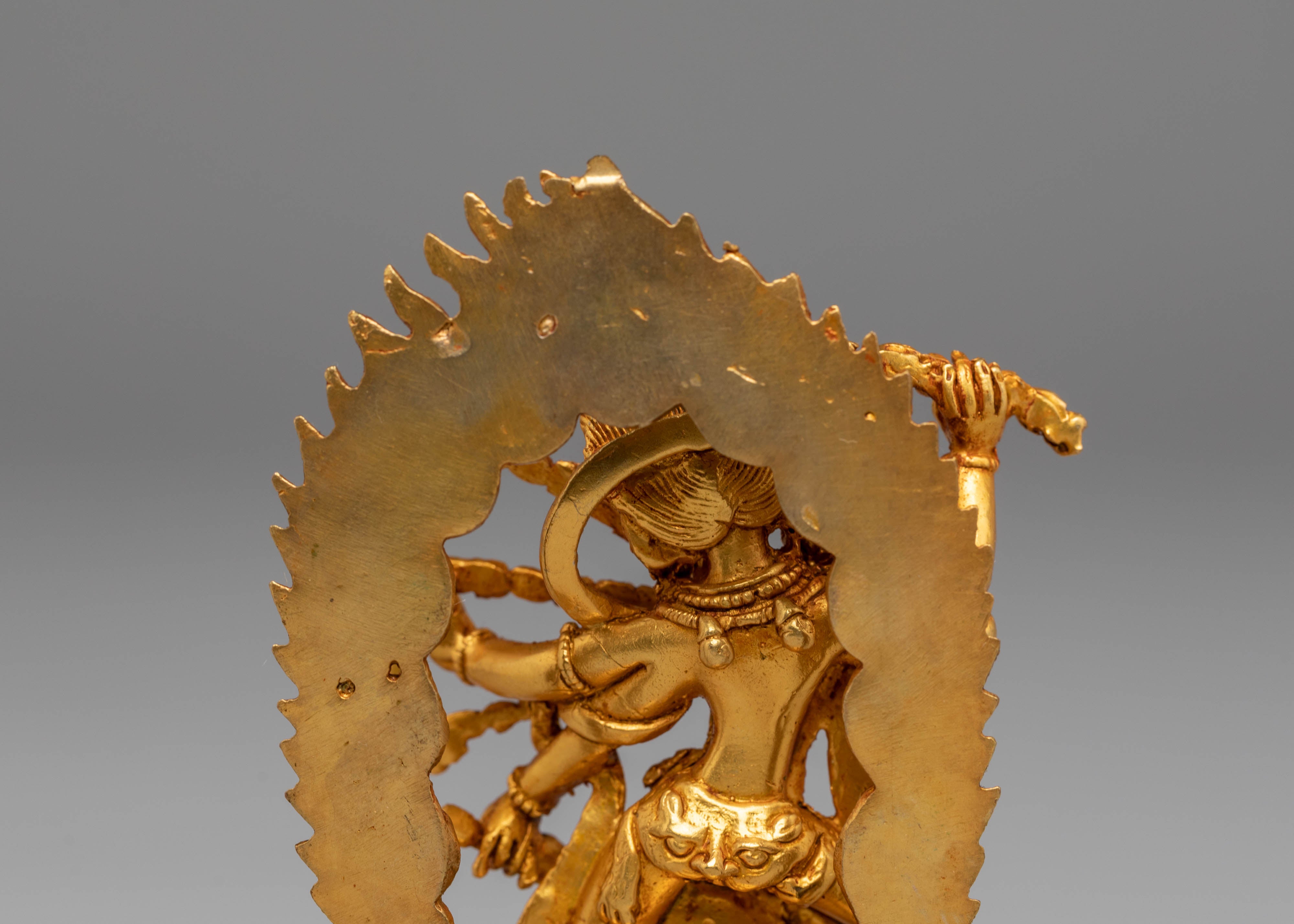 The statue captures Kurukulla in her dynamic, multidimensional form—one where she stands on a lotus pedestal, symbolizing purity. She is shown with multiple arms holding symbolic weapons and charms, alluding to her control over energies and transformation. The gold-plated finish brings an aura of sacred power, while the intricate flame-like halo surrounding her represents the goddess’s transformative energy and fiery passion. Her vibrant expression, with a confident stance and raised arms, reflects her power to attract and dominate the energy around her, making the statue not just a spiritual symbol but a powerful ritual tool.