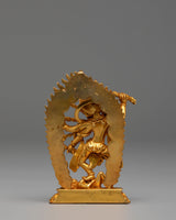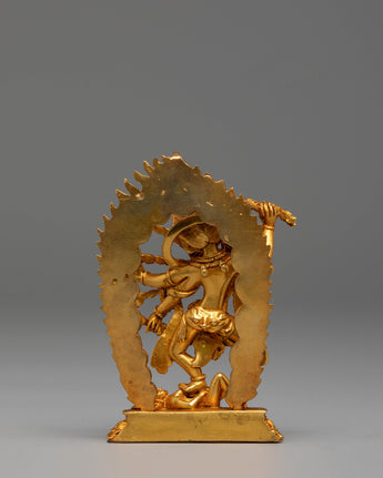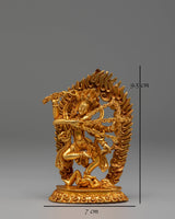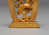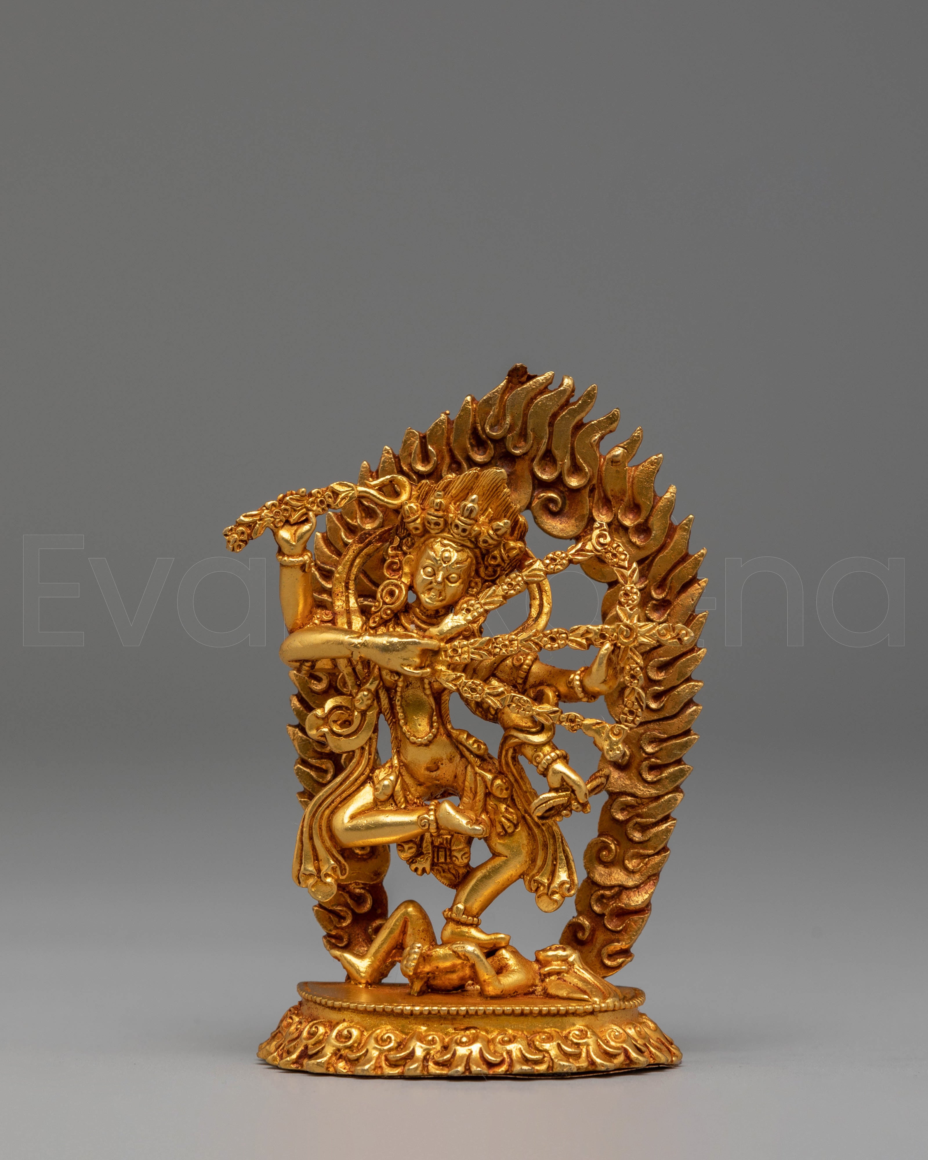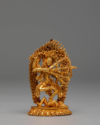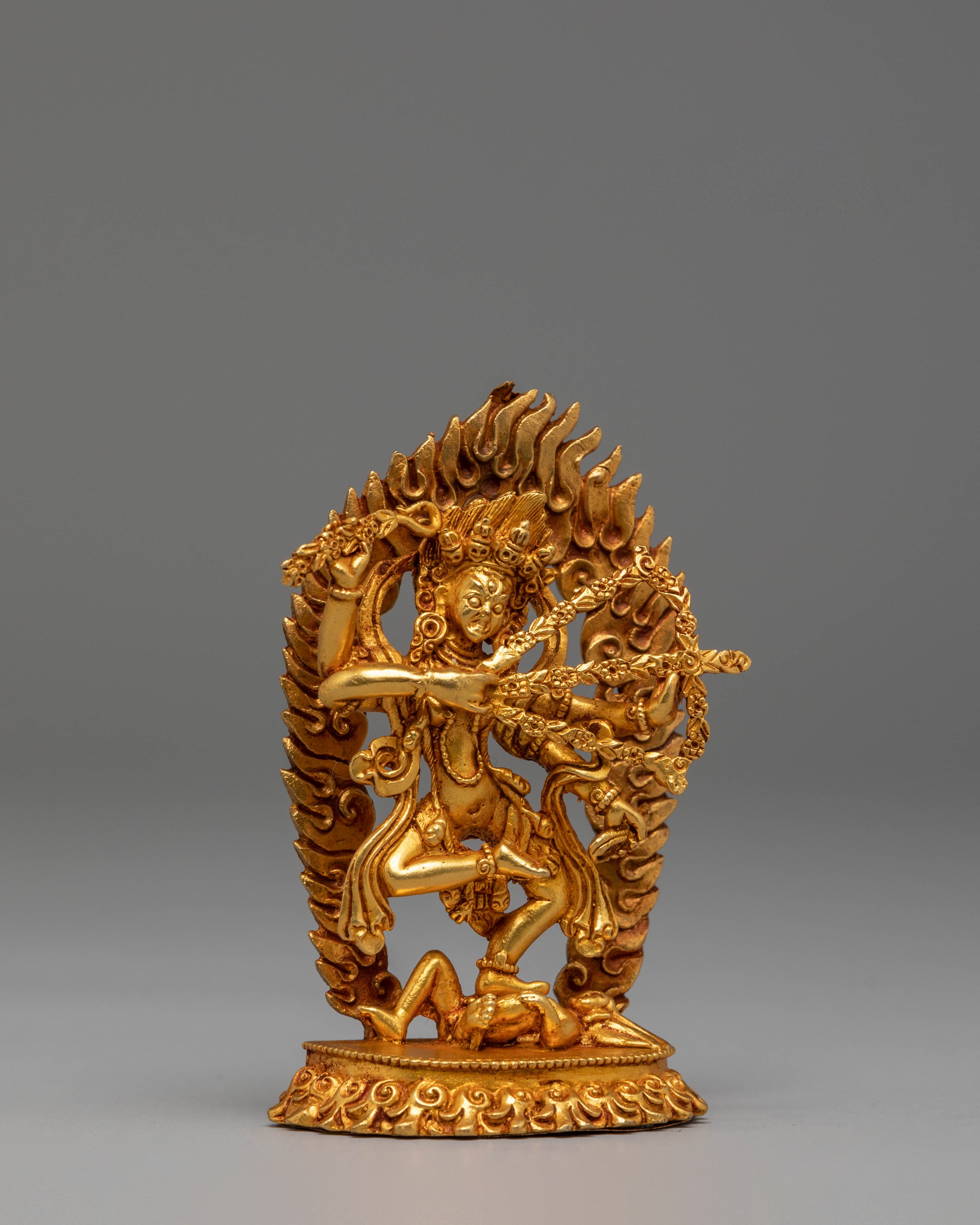 The statue captures Kurukulla in her dynamic, multidimensional form—one where she stands on a lotus pedestal, symbolizing purity. She is shown with multiple arms holding symbolic weapons and charms, alluding to her control over energies and transformation. The gold-plated finish brings an aura of sacred power, while the intricate flame-like halo surrounding her represents the goddess’s transformative energy and fiery passion. Her vibrant expression, with a confident stance and raised arms, reflects her power to attract and dominate the energy around her, making the statue not just a spiritual symbol but a powerful ritual tool.