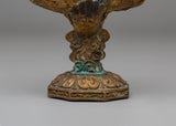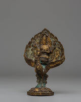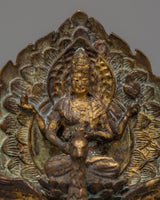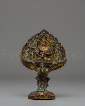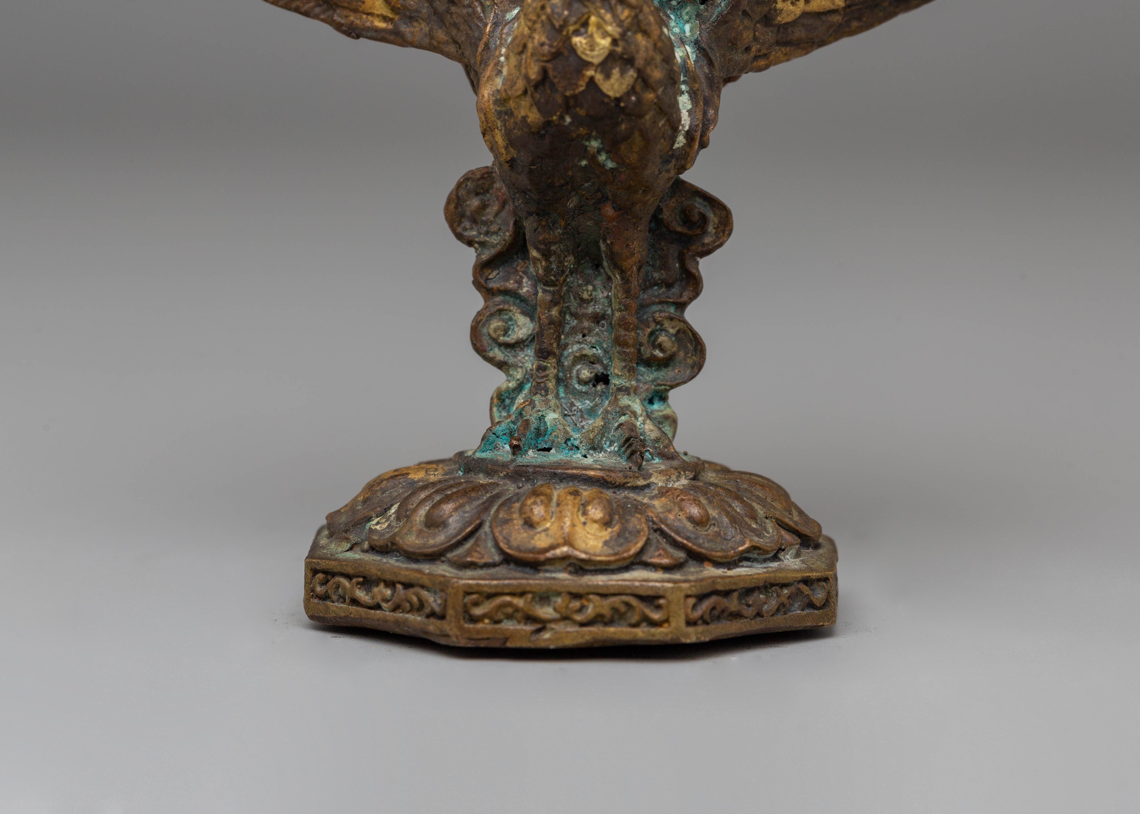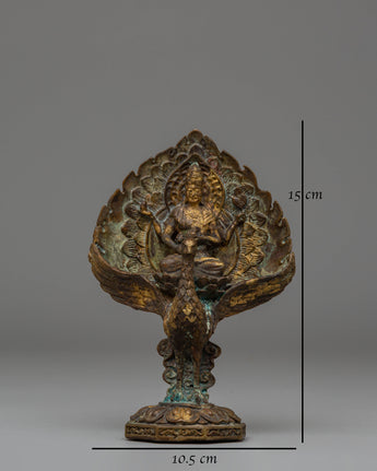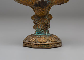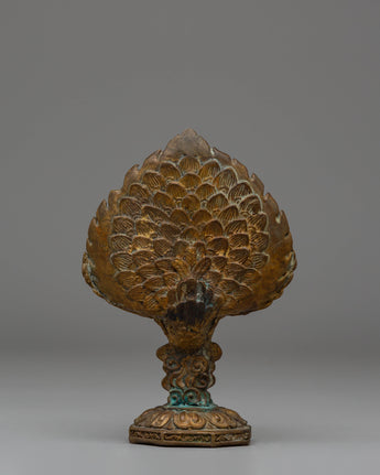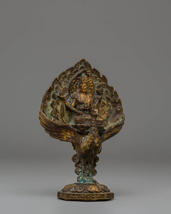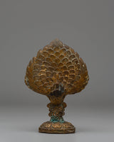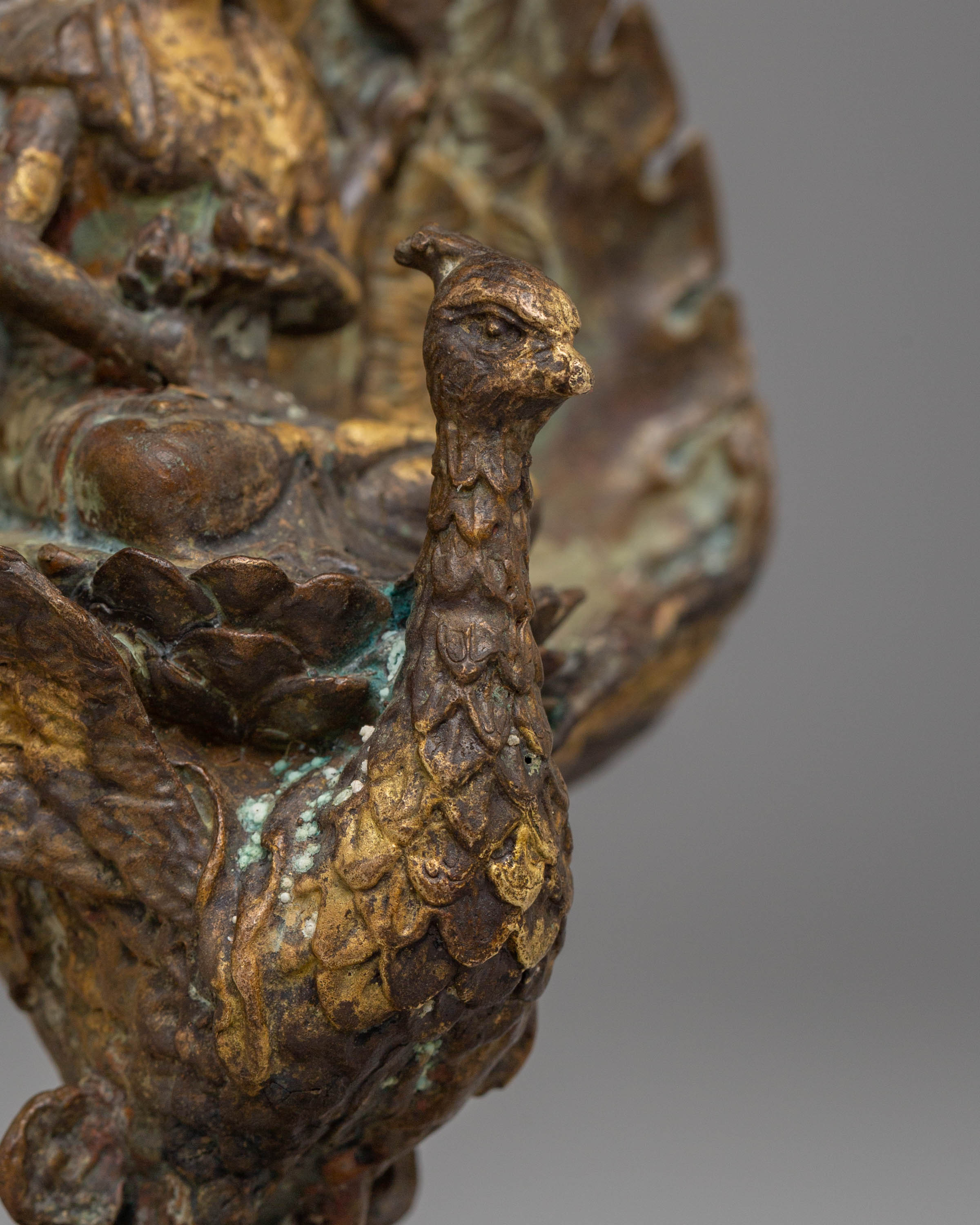 This statue depicts Mahamayuri, an excellent and strong spiritual character in Buddhism. Mahamayuri, also known as the "Great Peacock," is adored for her power to protect against evil forces and bestow gifts of peace and prosperity. This magnificent statue is meticulously made from copper and finished with dazzling gold plating, giving it a radiant and spiritual presence. The beautiful design and elegant depiction of Mahamayuri capture the spiritual energy she embodies, making this statue a powerful emblem for your house, temple, or meditation place.