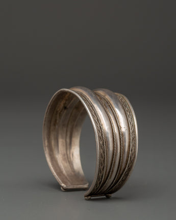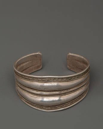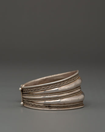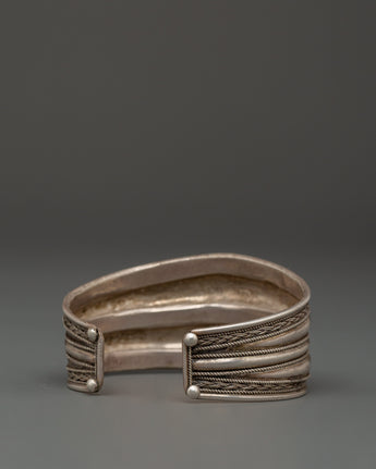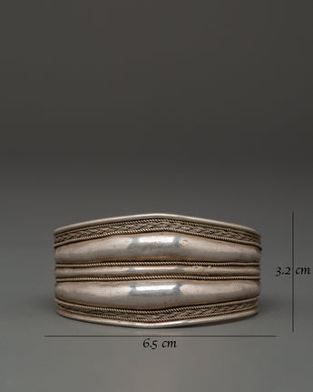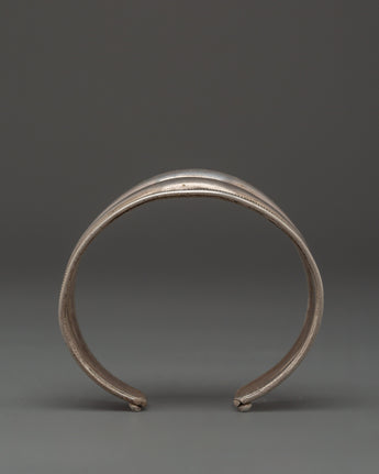 Crafted from 92.5% sterling silver, this bracelet represents strength and tenacity, which are highly valued in Tibetan tradition. The elegant, polished bands are surrounded by exquisite design, representing unity and continuity. Worn alone or layered, this cuff provides both visual impact and a fixing, stabilizing presence. It is excellent for spiritual practitioners, ethnic art devotees, and anybody who values significant, handcrafted craftsmanship.
