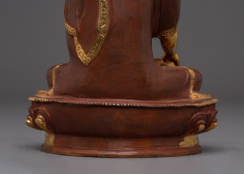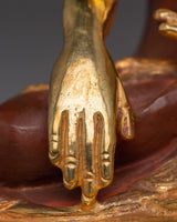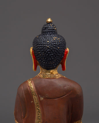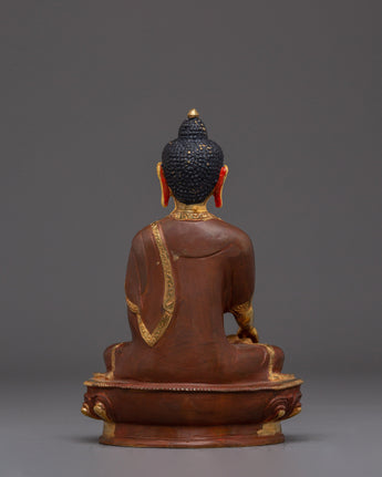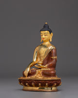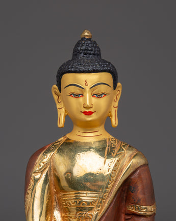 Supreme Enlightenment Shakyamuni Buddha stands 8.1 inches (20.5 cm) in height with a base measuring 5.5 inches (14 cm), and weighs 1.14 kilograms, making it a compact yet visually striking piece. Expertly made from a copper body, it is adorned with radiant 24K gold gilding that enhances its sacred presence and rich visual appeal. The statue is further detailed with delicate gold and acrylic paintings, showcasing intricate craftsmanship and traditional Himalayan artistry.