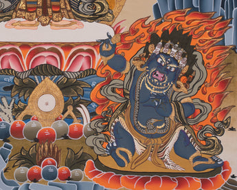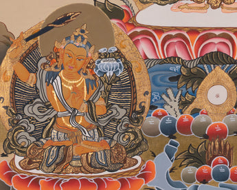This figure, with a thousand arms stretching outward, each bearing a sign of compassion or protection, represents the Bodhisattva's pledge to help all those suffering in the cycle of samsara. At the painting's peak, lesser portrayals of his various forms underline his omnipresence. The central figure is dressed in vibrant robes and adorned with celestial jewels, exuding a sense of divine peace. Beneath the central Thousand-Armed Bodhisattva, the thangka depicts Manjushri and Vajrapani, two respected Bodhisattvas who represent wisdom and power. Manjushri, the Bodhisattva of knowledge, is depicted carrying a flaming sword, symbolizing the dissolution of ignorance. At the same time, Vajrapani, the protector and deity of spiritual might, holds a vajra (thunderbolt), representing unbreakable strength. This thangka is ideal for meditation settings or as an altar centerpiece, as it promotes healing, transformation, and unwavering spiritual support.