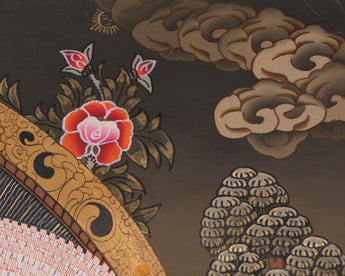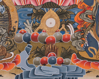 Avalokiteshvara is depicted in this powerful Thousand Armed Bodhisattva Thangka in his most magnificent form, radiating unending compassion and the capacity to help all sentient beings. This thangka was meticulously hand-painted by a professional Nepali artist, demonstrating great skill and attention to detail. It is painted on durable cotton canvas with high-quality acrylic colors, which produce brilliant and rich tones that bring the artwork to life. Genuine 24K gold is meticulously applied to numerous aspects of the painting, heightening the divine presence of the figures and lending a beautiful glow to the overall composition. The use of these materials maintains the thangka's long-lasting beauty while also preserving its intricate designs, which symbolize both artistic tradition and spiritual depth.
