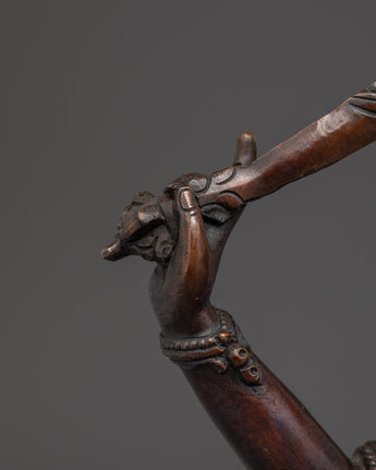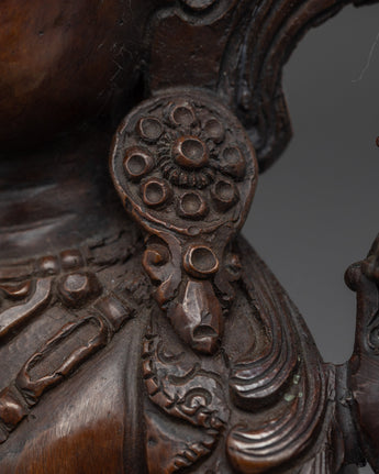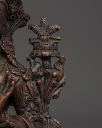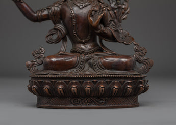 The Tibetan Art of Manjushri is crafted from oxidized copper, showcasing intricate artistry and traditional symbolism. Measuring 9.4”/24cm in height and 7.7”/19.5cm at the base, it weighs 1.78 kg. Manjushri, the Bodhisattva of Wisdom, is revered in Mahayana and Vajrayana Buddhism for his ability to cut through ignorance with the sword of wisdom and illuminate the path of understanding. This statue is ideal for meditation spaces, study areas, or spiritual collections that focus on clarity and insight.