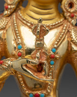 Tibetan Art of Vajrasattva is handcrafted from copper and adorned with 24K gold gilding, intricate gold and acrylic paintings, and gemstones. Measuring 9”/23cm in height and 6.7”/17cm at the base, it weighs 1.50 kg. Vajrasattva is revered in Vajrayana Buddhism as the deity of purification, associated with the 100-syllable mantra and the practice of clearing negative karma. Ideal for personal altars, meditation spaces, or sacred collections.