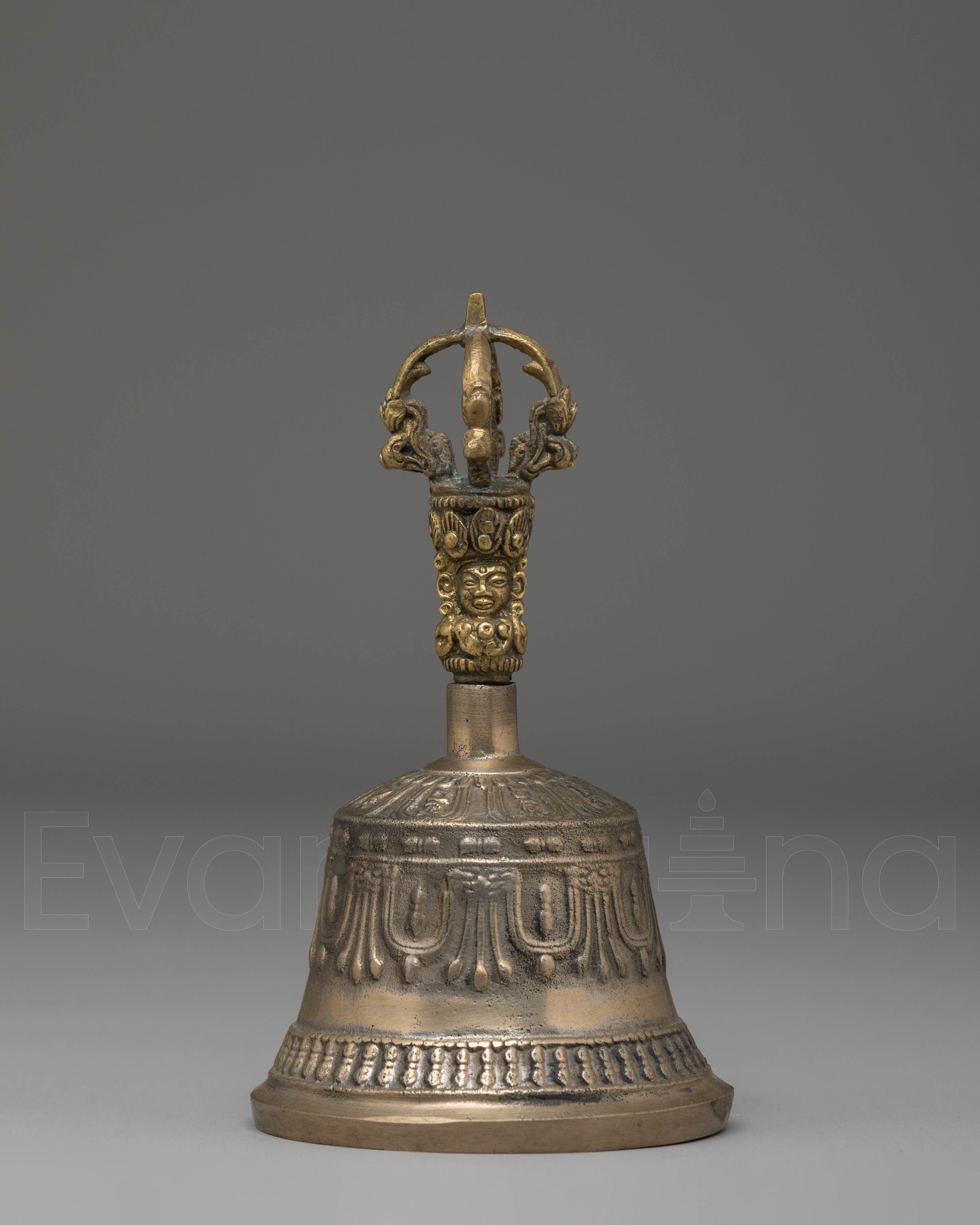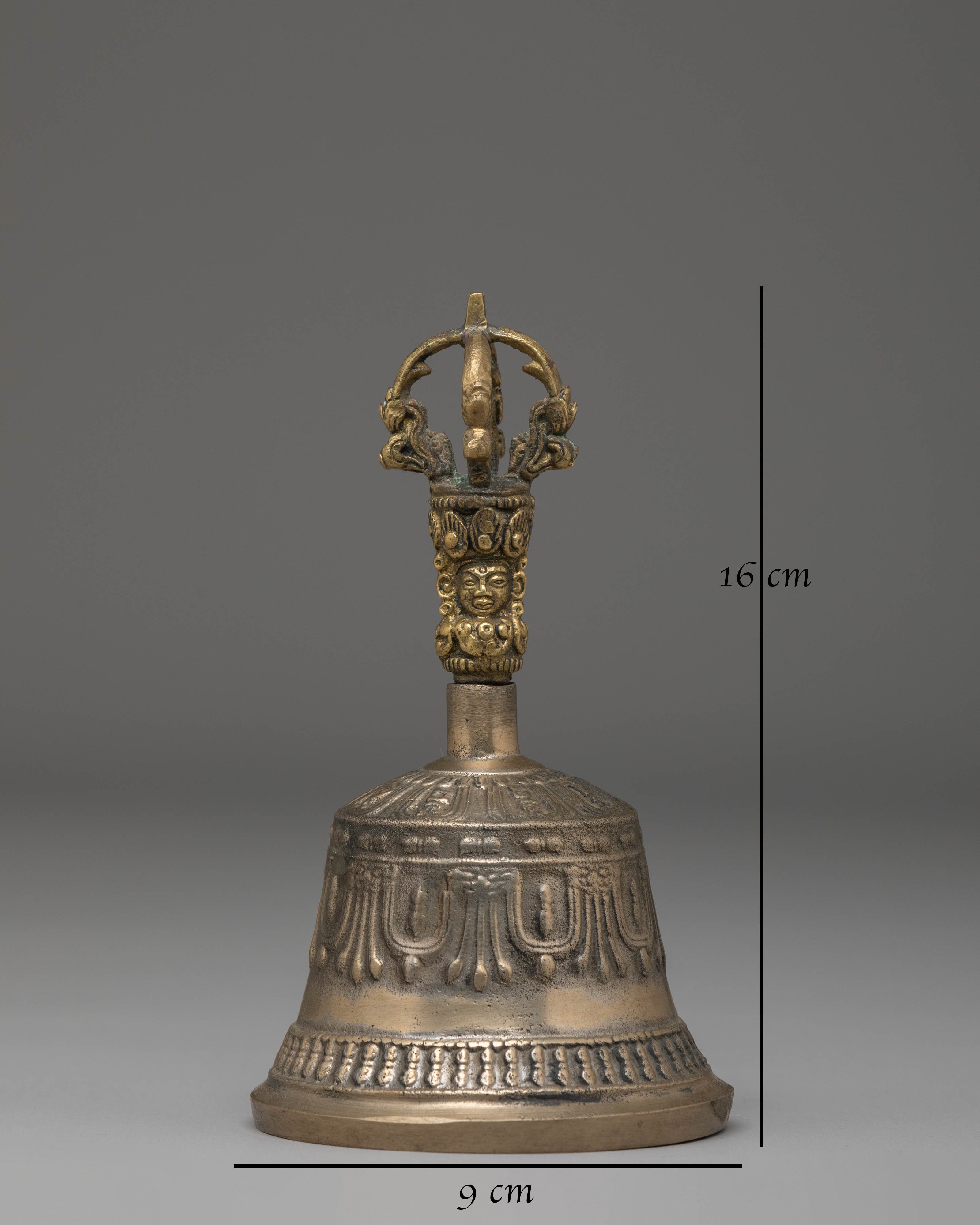 The bell's design features intricate patterns that symbolize Buddhist motifs, including clouds, lotus petals, and swirling waves, all of which represent impermanence, purity, and spiritual enlightenment. The handle of the bell is adorned with a deity's face, which reflects the divine connection during prayer and ritual. When rung, this bell produces a deep, calming resonance that helps clear the mind and focus the spirit during meditation or puja.