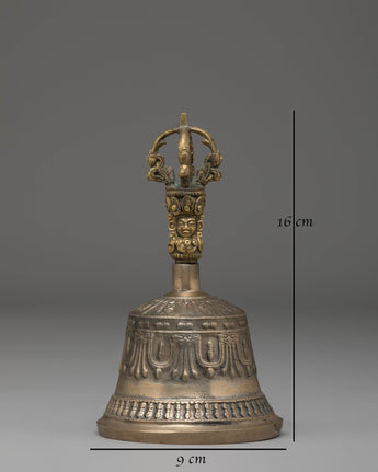 This Tibetan Buddhist Bell for Puja is made of bronze and intended for use in rituals, meditation, and spiritual ceremonies. Its dimensions are 16cm in height and 9cm in breadth, and it weighs 0.34kg. It produces a clear, resonant tone that complements any religious place. The bronze body is traditionally used for its long-lasting spiritual power, while the bell's ornate grip depicts a holy face, symbolizing spiritual protection and awakening.