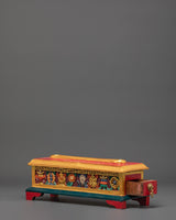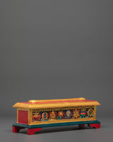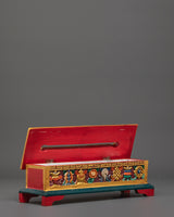 The Tibetan Buddhist Incense Burner measures 12.5cm in height and 36cm in width, weighing 0.98kg. Crafted from wood and finished with vibrant acrylic colors, this incense burner is designed to bring sacred energy and tranquility to meditation spaces, altars, or spiritual corners. Its elongated design allows for multiple incense sticks, providing a calming aroma that enhances mindfulness, focus, and spiritual practice. The intricate detailing reflects traditional Tibetan Buddhist symbolism, making it both a functional and meaningful addition to any sacred space.