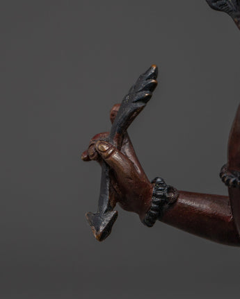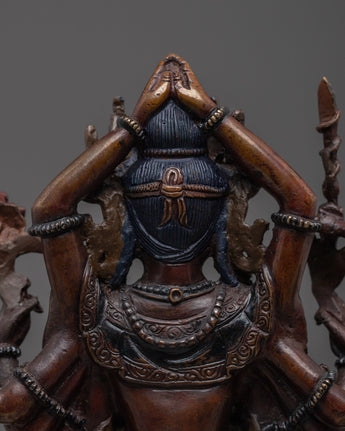 Tibetan Buddhist Sculpture of Namasangati stands 6.5” (16.5cm) tall with a 6.1” (15.5cm) base and weighs 0.98 kg. Crafted from oxidized copper, this handcrafted piece embodies traditional Tibetan spiritual artistry, perfect for ritual offerings, meditation spaces, or sacred home altars.