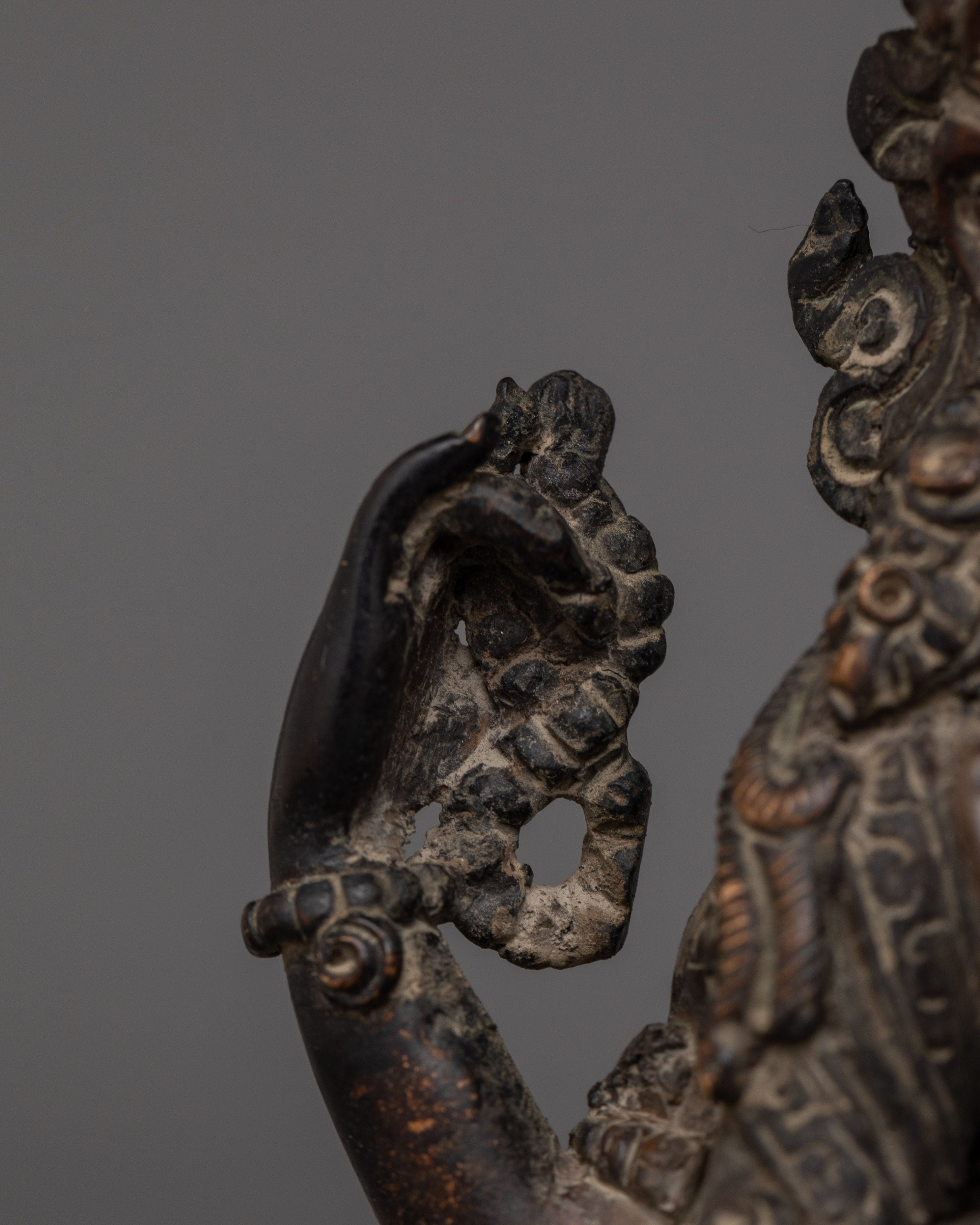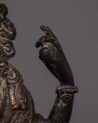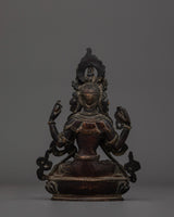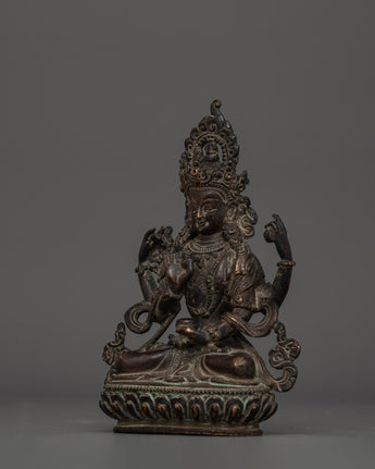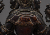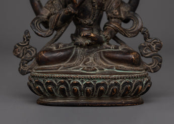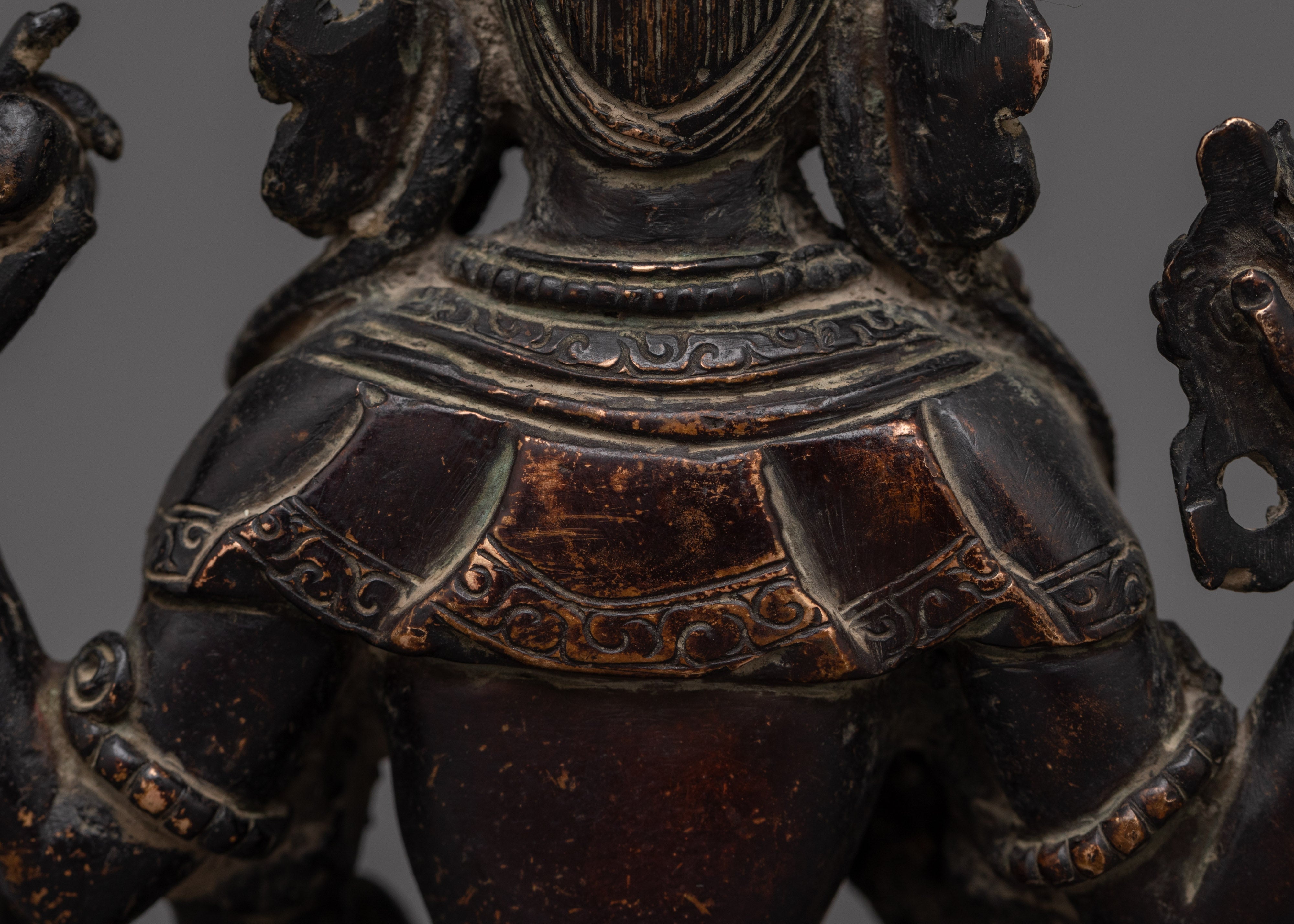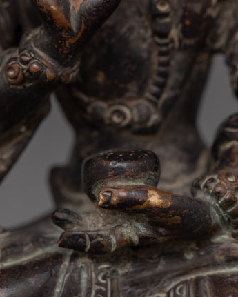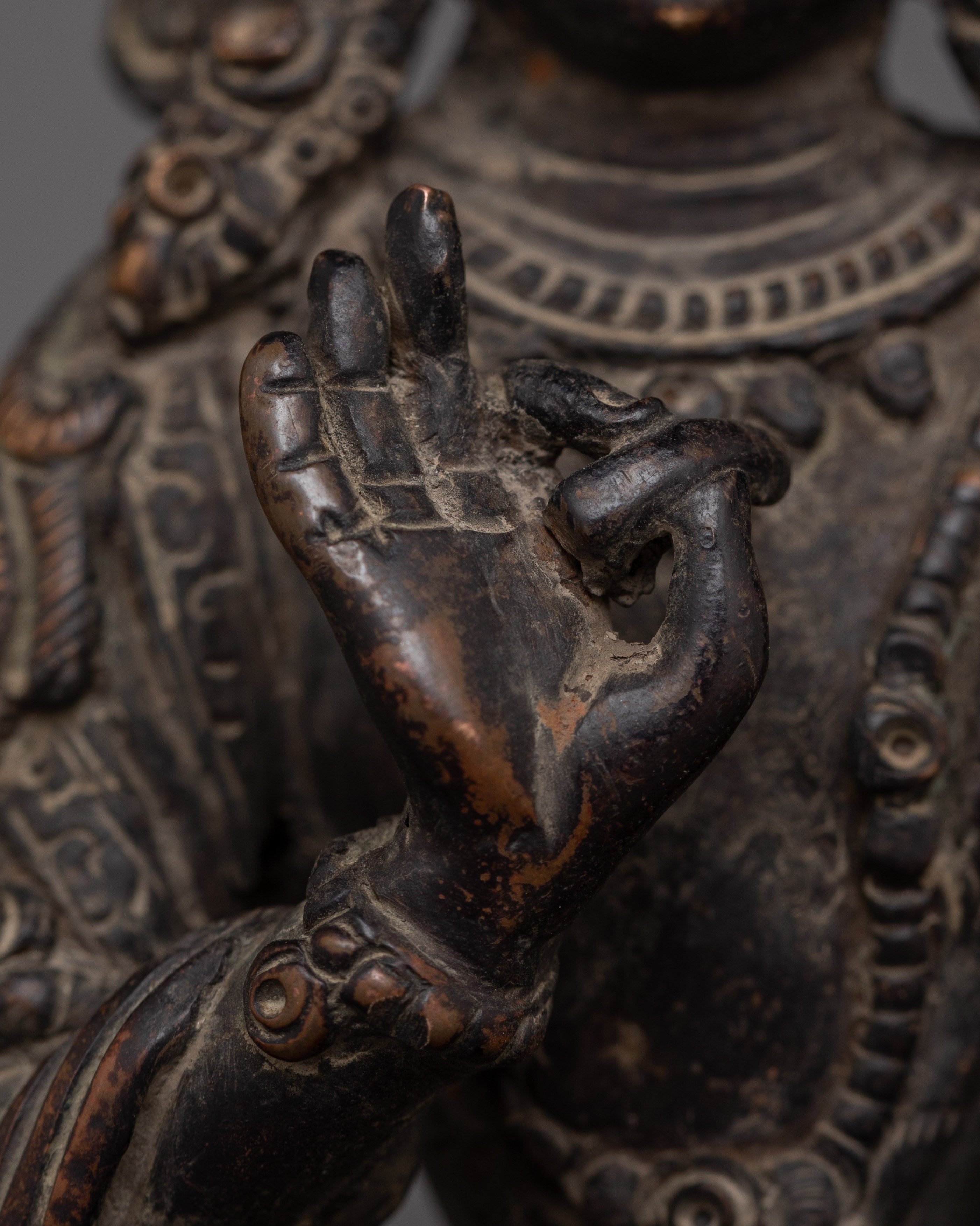 This handmade statue of Prajnaparamita is standing at 6.3”/16cm (Height) and 4.7”/12cm (Base). This statue is composed of a black oxidized copper body and an antique finish. Designed by talented Nepalese artisans, this detailed sculpture is ideal for altars, meditation areas, or as a meaningful decorative item for individuals seeking to cultivate awareness in their daily lives.
