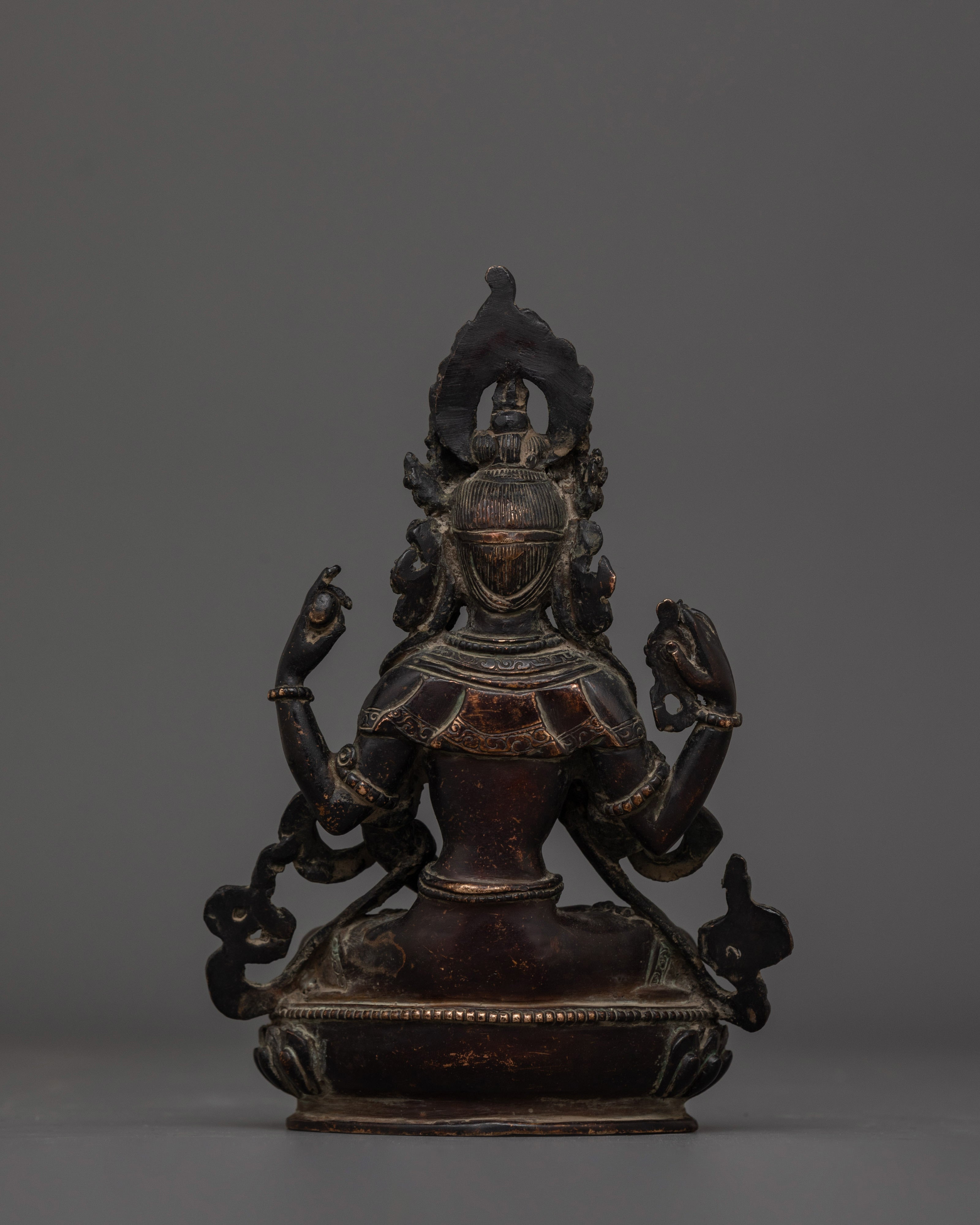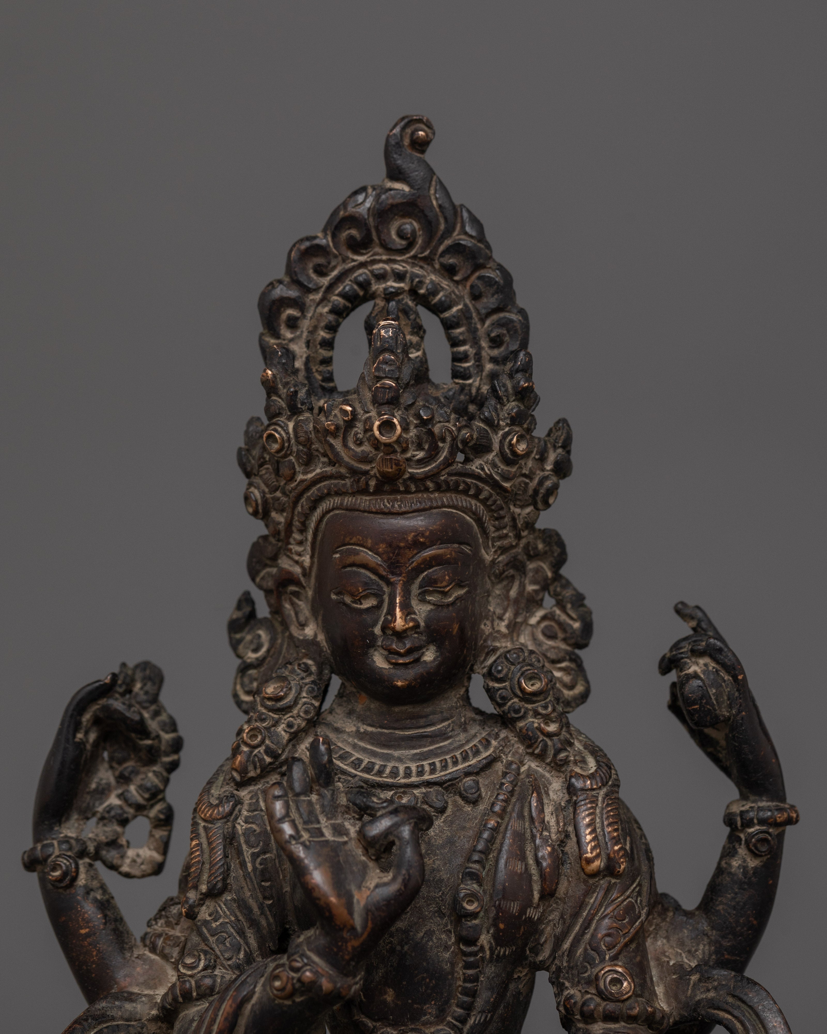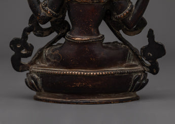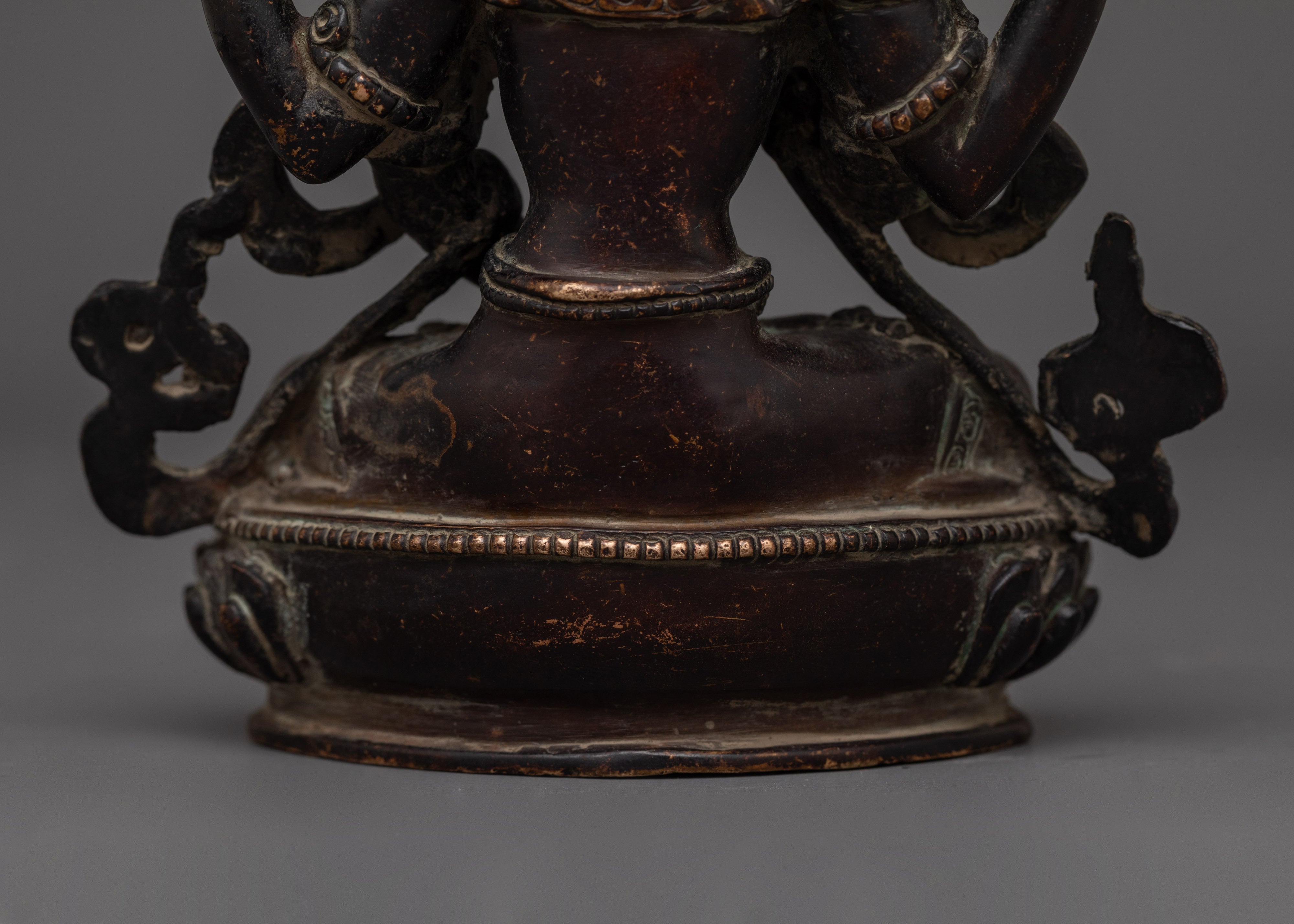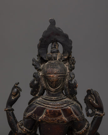 This handmade statue of Prajnaparamita is standing at 6.3”/16cm (Height) and 4.7”/12cm (Base). This statue is composed of a black oxidized copper body and an antique finish. Designed by talented Nepalese artisans, this detailed sculpture is ideal for altars, meditation areas, or as a meaningful decorative item for individuals seeking to cultivate awareness in their daily lives.