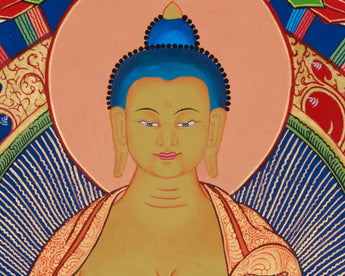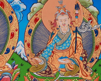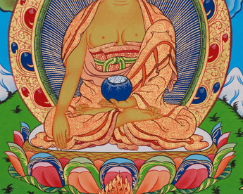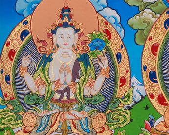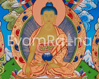 This horizontal thangka features Shakyamuni Buddha art with Chenrezig and Guru Rinpoche, each representing a powerful aspect of enlightened activity. It is hand-painted on high-quality cotton canvas with vivid acrylic colors and 24K gold accents. Created by a skilled Nepali artist in the traditional style, it radiates clarity, balance, and sacred beauty, featuring mindful artistry and spiritual symbolism.