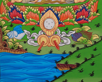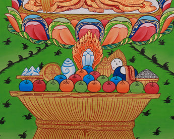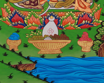 Below the three sacred beings, each has a uniquely arranged offering set. Shakyamuni Buddha's offerings are elevated golden platforms with eight tormas, symbolizing generosity and enlightenment. Chenrezig’s side features offerings associated with bodhisattvas, including jewel-like vases and sacred conch shells. At the same time, Guru Rinpoche’s altar includes tantric objects such as skull cups and vases symbolizing spiritual power and ritual mastery. The lush landscape, blooming lotuses, and flowing rivers connect the three figures, allowing each to stand out with dignity and purpose.