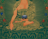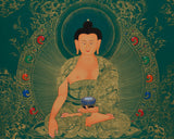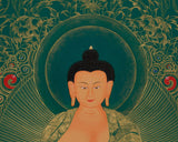 This Traditional Shakyamuni Buddha Artwork depicts Siddhartha Gautama, the historical Buddha, sitting in tranquil meditation on a lotus seat. This magnificent Thangka is delicately hand-painted on cotton canvas, demonstrating a traditional artistic style passed down through generations. The artist has skillfully rendered the Buddha's vivid portrayal using acrylic colors, enhancing the composition with rich, intricate strokes. The genuine 24K gold is expertly blended with the green backdrop to produce a captivating look that heightens the piece's spiritual atmosphere. This golden blend enhances the artwork's brilliance by adding a sense of peace and divine light. This Thangka's skilled work ensures longevity and visual impact, resulting in a magnificent and essential piece.