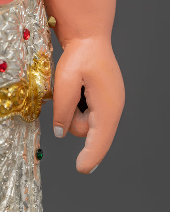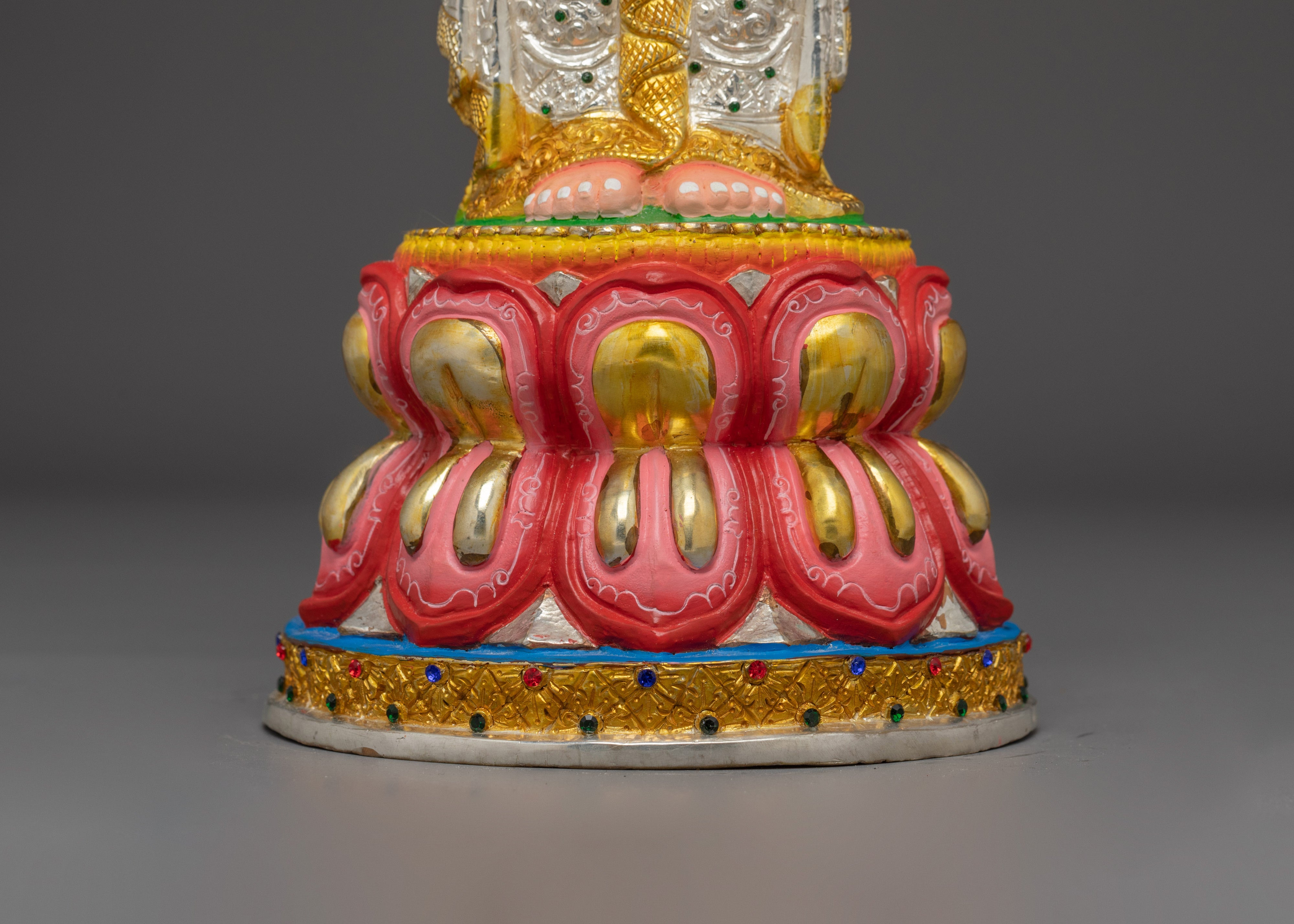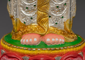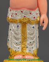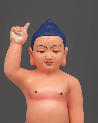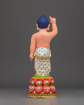 The Tranquil Statue of Little Buddha beautifully portrays the infant Buddha at the moment of his divine awakening, symbolizing purity, enlightenment, and the beginning of wisdom. This stunning sculpture is meticulously handcrafted from copper and painted with rich acrylic hues that enhance the warmth and serenity of the piece. Depicted with one hand pointing toward the heavens and the other toward the earth, the Little Buddha embodies the profound declaration made at his birth — acknowledging his awakened nature and universal truth. His gentle expression and delicate details, from the serene features to the ornate lotus pedestal, reflect the depth of spiritual artistry and devotion that define traditional Himalayan craftsmanship.