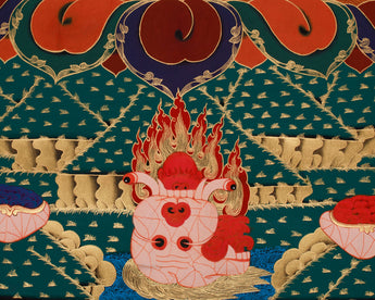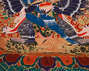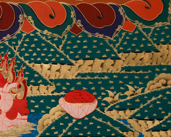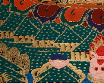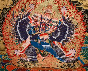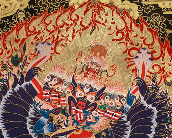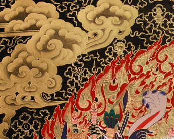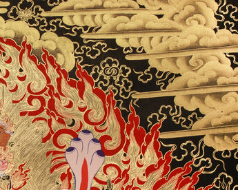 Vajrabhairava Yamantaka is the wrathful manifestation of Manjushri, the Bodhisattva of Wisdom. Created in the traditional Tibetan style, this hand-painted thangka features acrylic colors and 24K gold accents. The intricate gold detailing highlights the deity's power, while the deep, bold colors enhance his formidable presence. Yamantaka, revered as the Destroyer of Death, symbolizes triumph over ignorance and the cycle of rebirth.