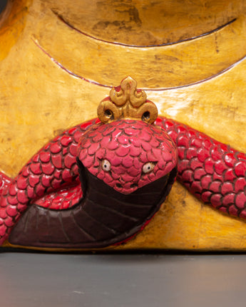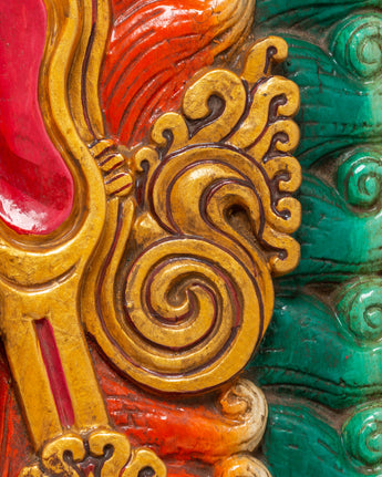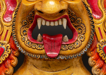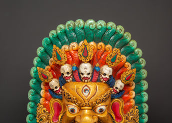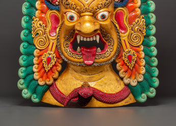 This wooden mask, carefully constructed by Himalayan artisans, is rich in symbolic features, including three heads adorned with ritual skull crowns, a fierce stare, and burning brows, all depicted in vibrant colors. In tantric rituals, Vajrakilaya is called upon to destroy both internal and external barriers; his presence is most potent when he is in a wrathful state. This revered piece of art will serve as a permanent spiritual guardian in any area thanks to its acrylic finish and substantial hardwood construction.