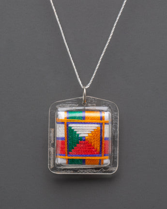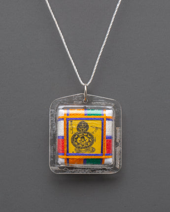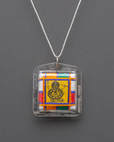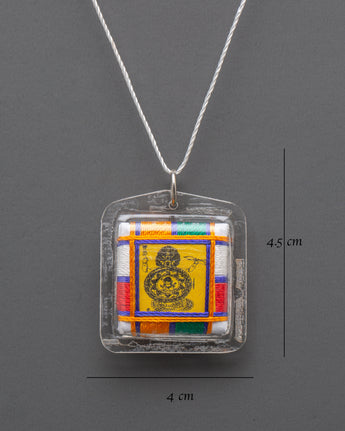The Vajrapani Buti for Accessory is a sacred Tibetan amulet that represents divine power, protection, and inner strength. This lightweight necklace, measuring 4.5cm in height and 4cm in breadth, and weighing 0.006kg, features a canvas rendition of Vajrapani, the defender and embodiment of the Buddha's might. This buti, enclosed in a clear plastic case and covered in brilliant multicolored thread, exudes spiritual energy and represents harmony by balancing the five elements of earth, water, fire, air, and space.