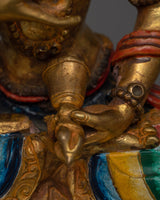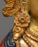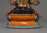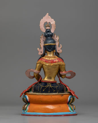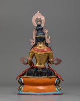 The 22.5 cm tall, handcrafted, small, colored Vajrasattva statue is expertly crafted from pure copper and features an antique finish. The superb 24K gold plating on this statue highlights its radiant presence and spiritual significance. Any area is made more peaceful and more evident by the artistically rendered, serene, and pure depiction of Vajrasattva. The lovely lotus throne upon which he sits is revealed through detailed carvings, and the complex patterns of his attire are demonstrated through detailed carvings.