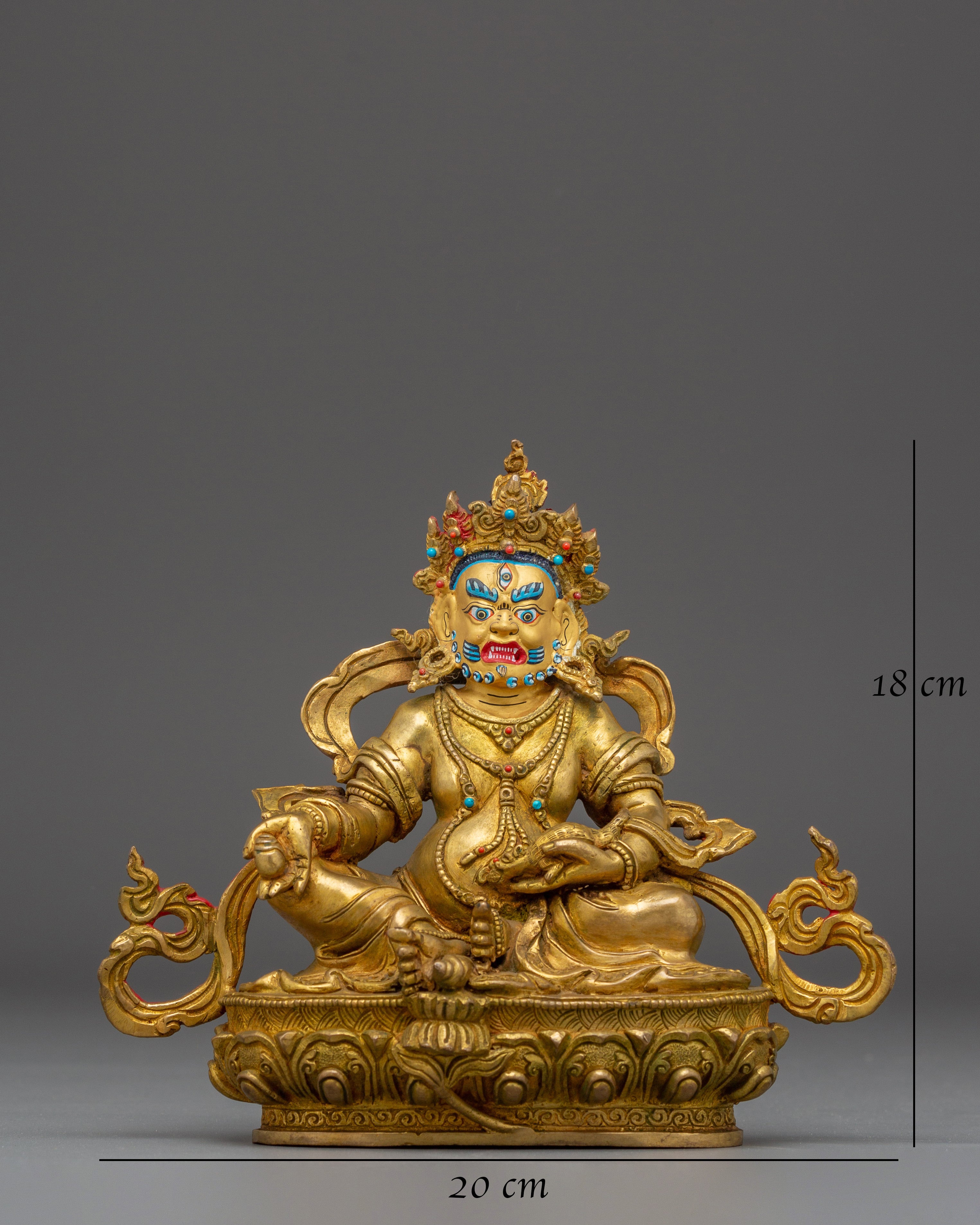 The Wealth Icon Dzambhala Handmade Statue is a beautifully detailed representation of the Buddhist deity associated with wealth and prosperity. This striking figure is crafted from copper and features a stunning gold gilded finish that highlights its intricate design. Standing at 18 cm tall, this statue exudes a powerful spiritual presence, perfect for enhancing any space with positive energy and attracting prosperity. The vibrant acrylic accents the deity’s facial features and jewels, giving it a rich, colorful appearance that enhances its allure.