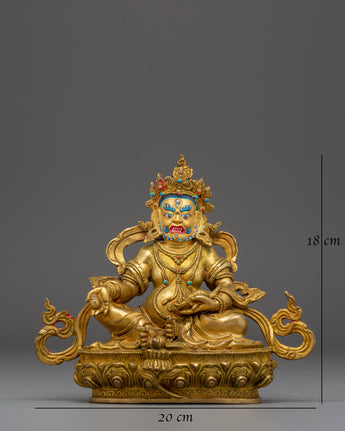 Dzambhala is a protective deity associated with wealth and prosperity. Many forms and traditions are associated with this wealthy deity, but he is usually depicted as yellow in color and holding a mongoose in his left hand. This statue has accurate traditional iconography and fine details.