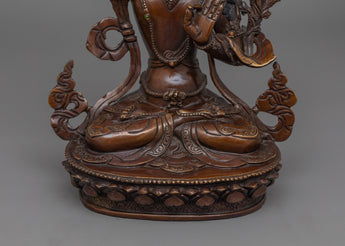 The Tibetan Bodhisattva Manjushri Wisdom Deity measures 10.2 inches (26cm) in height and 7.3 inches (18.5cm) at the base. The Bodhisattva of Wisdom is crafted from an oxidized copper body. The fine details are accentuated with intricate gold and acrylic paintings, while gemstones are thoughtfully placed to add depth and vibrancy. Crafted by expert artisans, this item symbolizes the rich traditions of Himalayan Buddhism, making it an important addition to altars, meditation places, or holy collections.