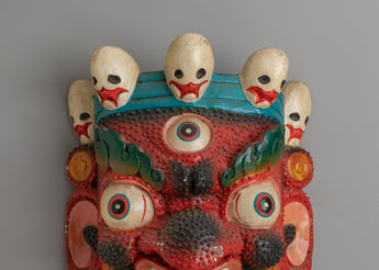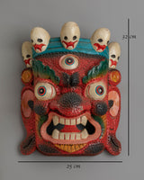 The mask showcases Bhairava's fierce expression—wide eyes, sharp teeth, and a crown adorned with skulls—symbolizing his strength, protection, and ability to overcome obstacles. The flame-like designs on the sides of his face represent the destruction of ignorance and the illumination of wisdom. The detailed acrylic paint brings the fierce expression to life, while the vibrant colors, including red, green, and blue, enhance the mask's dynamic visual appeal. This mask is both an art piece and a spiritual symbol, embodying divine protection and the fierce compassion of Bhairava.