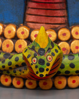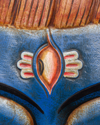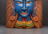 Bring heavenly presence and calm into your home with this Wooden Mahadev Wall Hanging, a magnificent portrayal of Lord Shiva, the Hindu god of transformation and transcendence. This handcrafted wooden mask, measuring 63 cm in height and 42 cm in width, features a deep blue complexion, delicate facial detailing, and religious motifs, including the third eye, a crescent moon, and a snake motif. Finished in rich acrylic colors, this piece exudes sacred energy and is excellent for meditation rooms, yoga studios, or personal shrines.