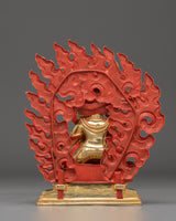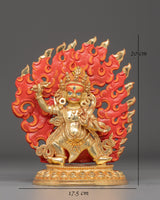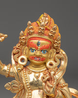 The Wrathful Bodhisattva Vajrapani Statue depicts one of Tibetan Buddhism's most respected protector bodhisattvas. Vajrapani, renowned for his fiery and protective character, embodies the strength and power required to conquer difficulties and preserve the Dharma. This statue, made of copper with a gold-plated finish, is 20cm tall, 17.5cm wide, and weighs 1.31kg. It is finely detailed with acrylic paints, making it an eye-catching addition to any meditation room or Buddhist shrine.