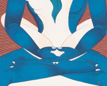The color of his skin is blue and he sits naked in 'vajra' posture, with his two hands placed in his laps in the gesture of meditation. Samantabhadra is the representation of the original nature of the mind and symbol of unity between awareness and compassion.