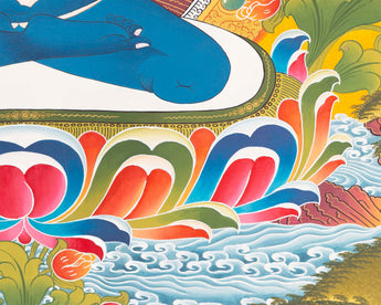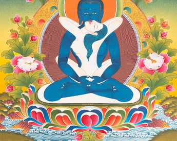 Representing Dharmakaya-the truth body of enlightenment, Samantabhadra thangka painting for your practice. In this traditional thangka painting, we can see the primordial Buddha, Samantabhadra in unison with his consort in Vajra posture. In this thangka painting Samantabhadra is depicted embracing his consort Samantabhadri in Yab-Yum, the sacred union.