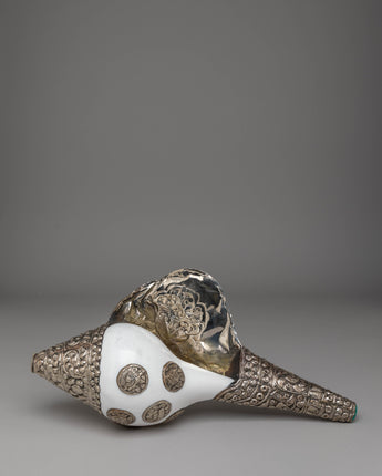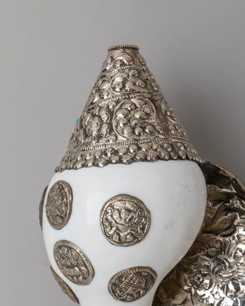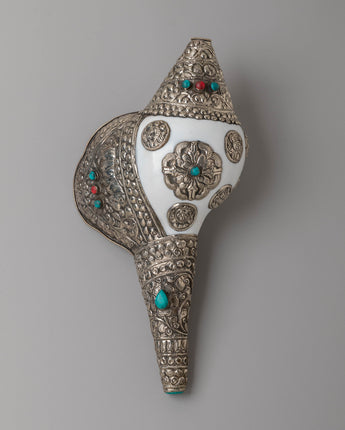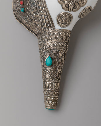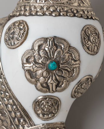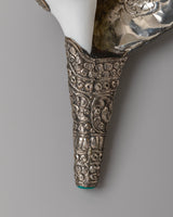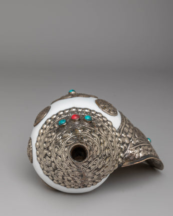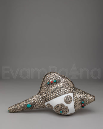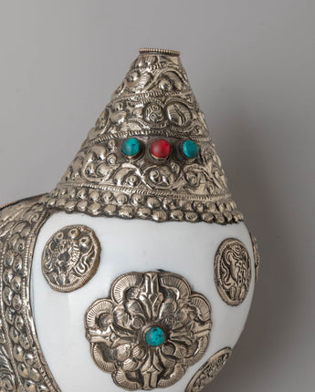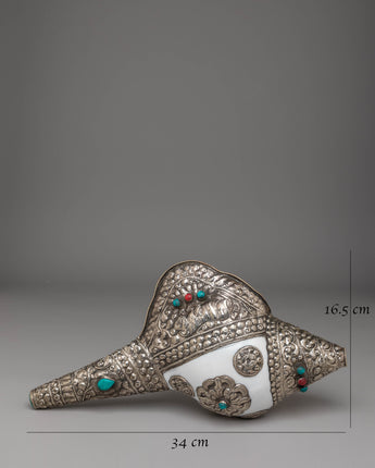 This handcrafted Buddhist conch measures 16.5 cm in height and 34 cm in width, with a weight of 1.34 kg. It is formed from a natural conch shell and enhanced with gemstones and silver, reflecting ceremonial designs used in Buddhist ritual instruments.