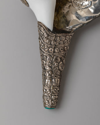 This conch is traditionally used in puja, Vajrayana ceremonies, and temple rituals. It serves as a sacred instrument to mark the beginning of rituals and devotional practices. Placed on an altar or used ceremonially, this handcrafted conch stands as a meaningful representation of auspicious sound and spiritual awakening within Buddhist practice.