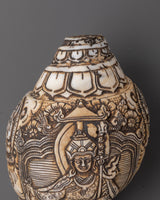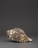 In Tibetan Buddhist tradition, the conch shell is a significant ritual artifact that represents the proclamation of truth and the propagation of Dharma across the world. The picture of Guru Rinpoche carved on this conch is particularly regarded for bestowing wisdom, spiritual power, and direction upon practitioners. The engraving's skill and intricacy make this item an excellent addition to any altar or meditation room, and it has great symbolic resonance for those who practice Tibetan Buddhism.