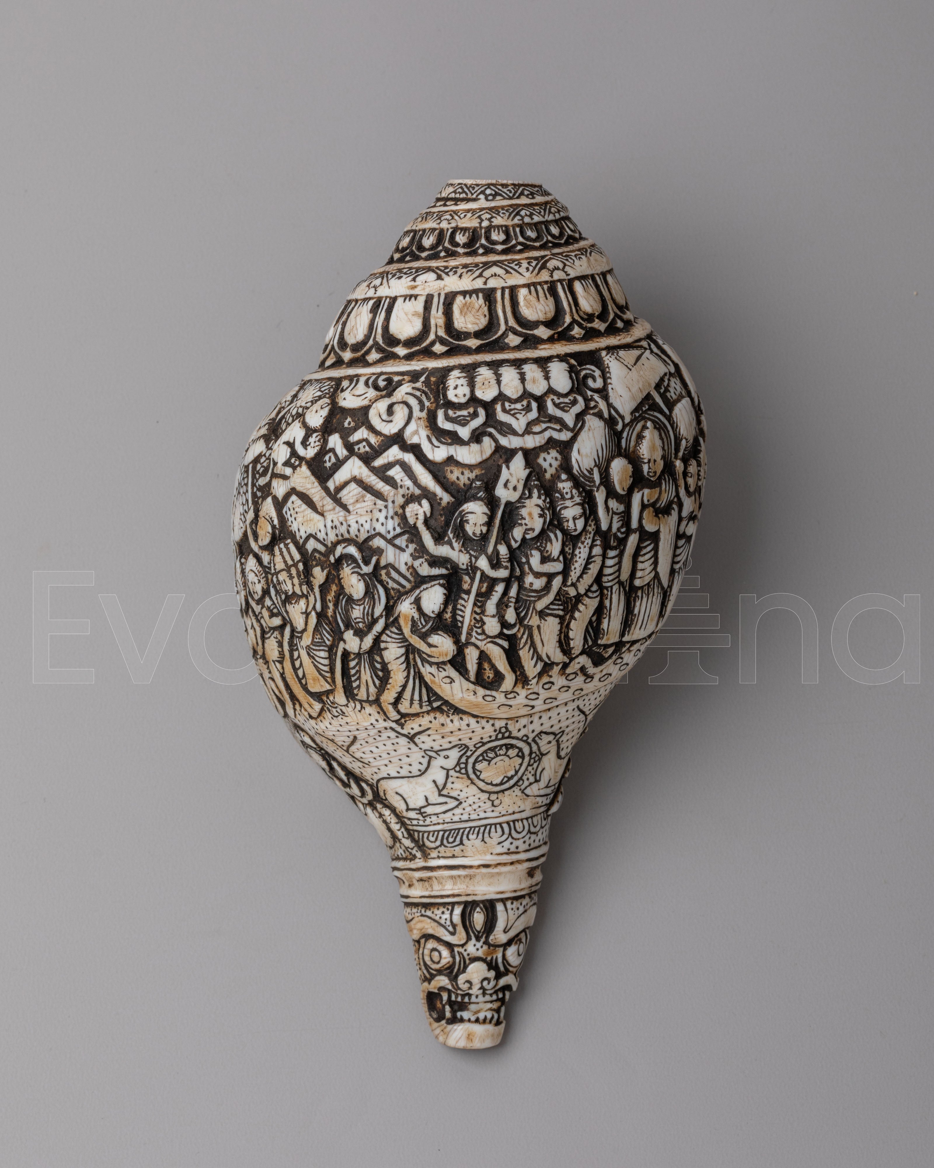 This conch shell holds deep symbolic meaning in Buddhism, representing purity, awakening, and the call to enlightenment. The intricate carvings of Buddha figures symbolize compassion, wisdom, and protection, while the floral motifs add a touch of beauty and harmony. Traditionally used in Buddhist ceremonies to signal the start of teachings or prayers, this conch shell serves as a powerful reminder of spiritual growth and inner peace. Its presence in your home or sacred space can enhance meditation, invite positive energy, and deepen your connection to Buddhist teachings.